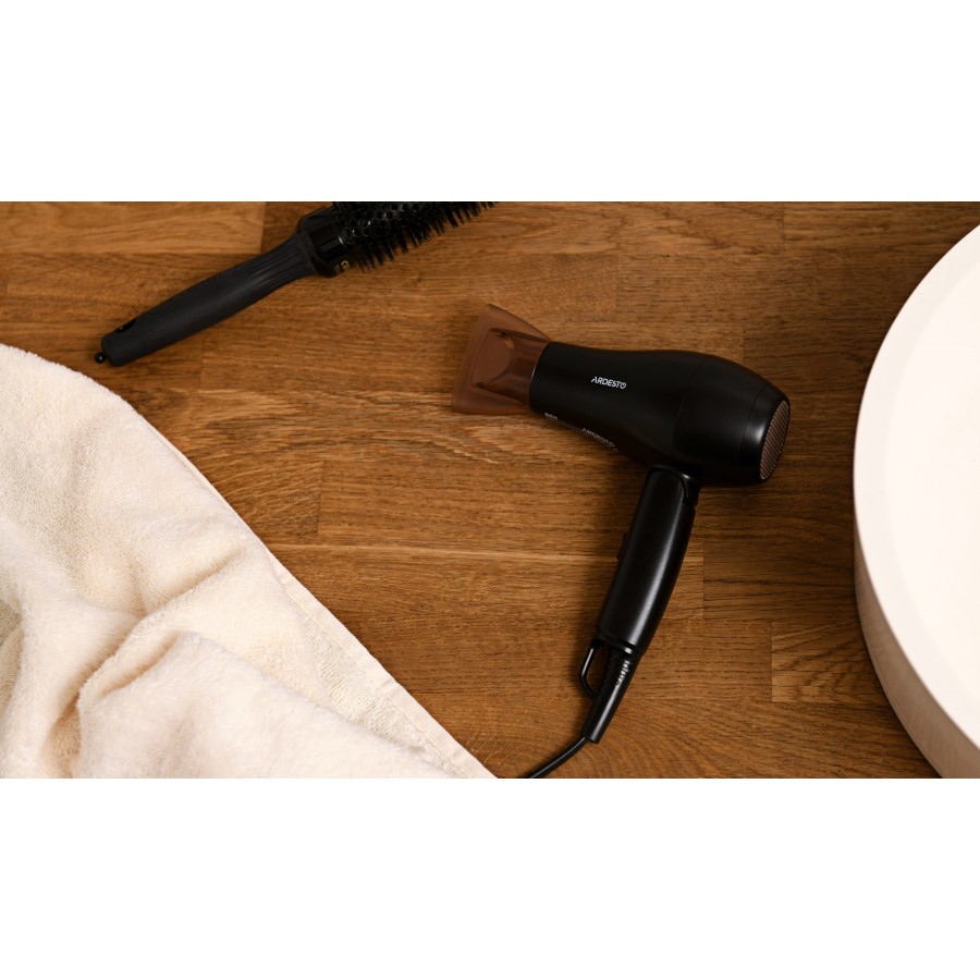 Фен виконаний у компактному корпусі з міцного термостійкого полікарбонату, в преміальній кольоровій гамі. Для зручного транспортування передбачена складана ручка, а для підвішування – спеціальна петелька.