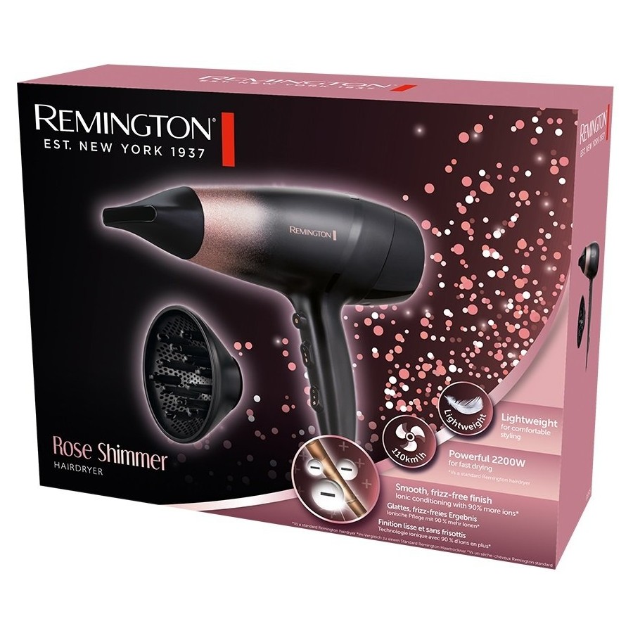 Фен Remington Rose Shimmer, 2200Вт, 3 режими, дифузор, іоніз-я, хол. обдув, чорно-рожевий (D5305)