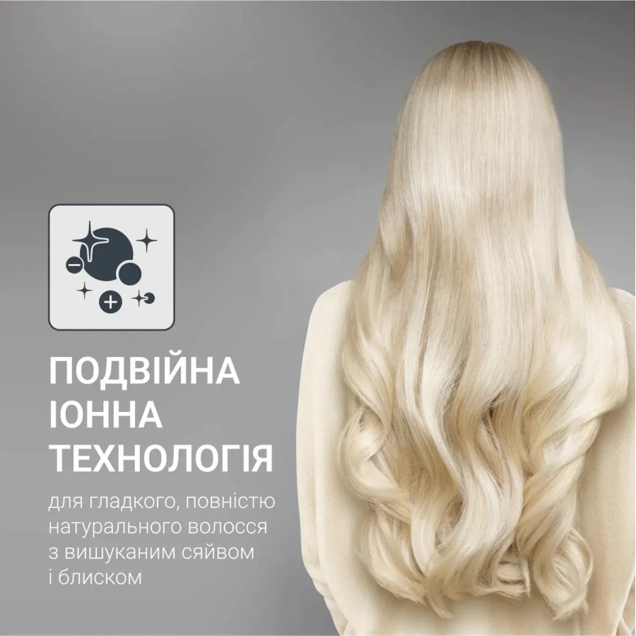Подвійна іонна функція та турмалінове покриття зменшують статику та пухнастість, залишаючи ваше волосся шовковистим і гладким із сяючим блиском.