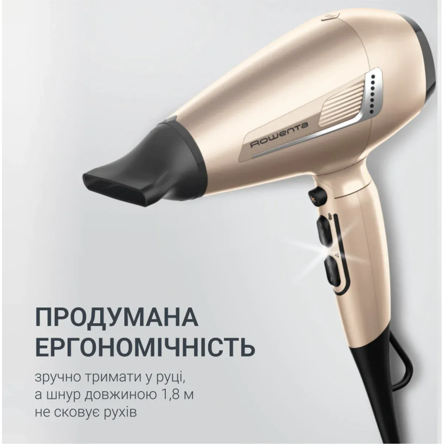Потужний професійний двигун змінного струму потужністю 2200 Вт забезпечує концентрований повітряний потік до 126 км/год — для професійного сушіння до 2 разів швидше* та результатів салонної якості. (*тест на сприйняття порівняно зі звичайним феном, 30 волонтерів, 1 місяць, Франція 2021 р.)