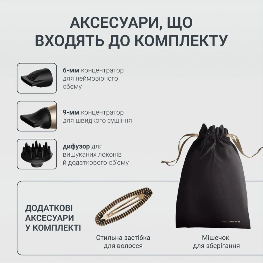 Повний пакет для укладки з 2 концентраторами (6 мм і 9 мм), дифузором, оксамитовим мішечком із золотистими стрічками та модною шпилькою для волосся.