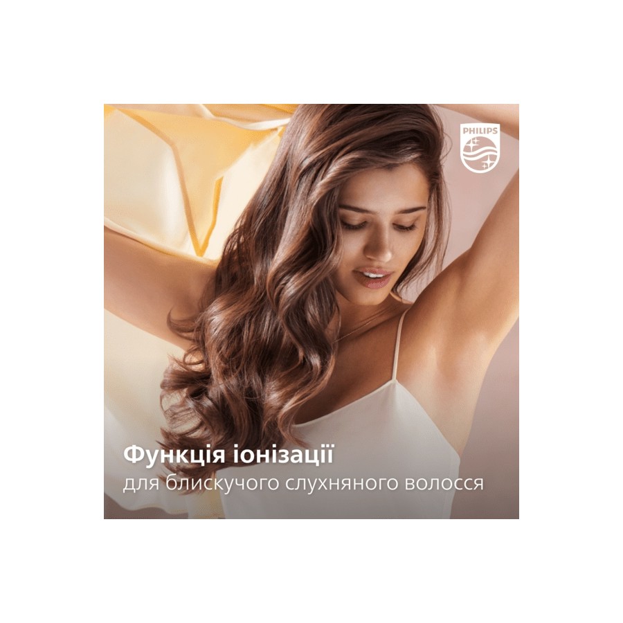 За допомогою функції іонізації волосся не електризується під час сушіння. Негативно заряджені іони запобігають наелектризованості, кондиціонують волосся і вирівнюють кутикули для підсилення блиску волосся. Результат – слухняне та гладеньке блискуче волосся.