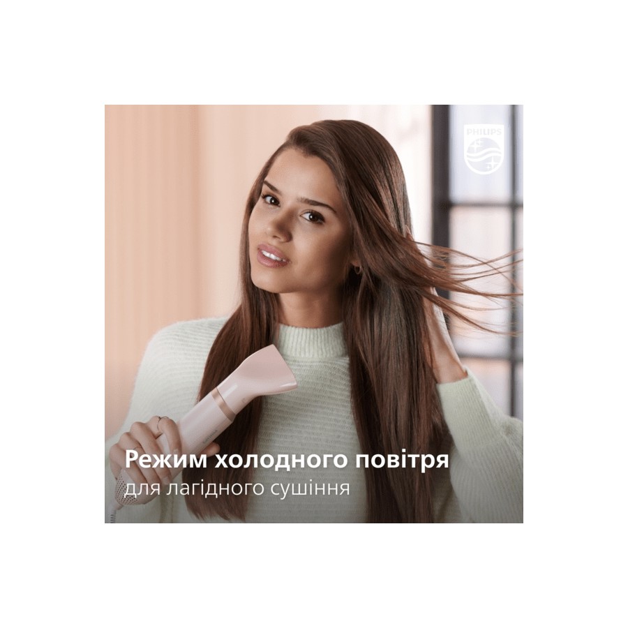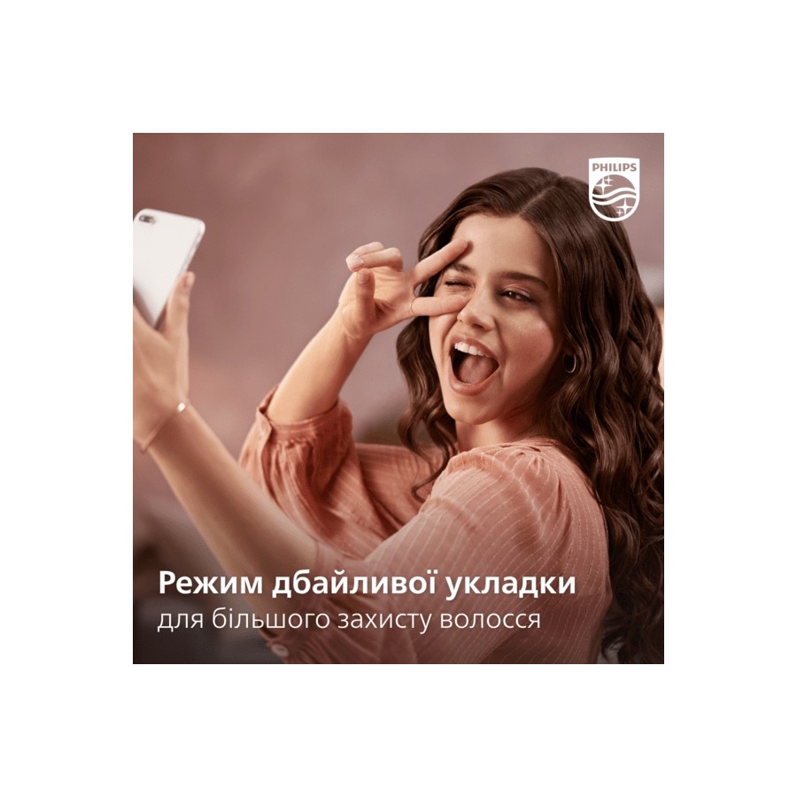 Налаштування "Догляд" забезпечує оптимальну температуру сушіння і захищає від пересушування. Волосся сушиться швидко з тим самим потужним потоком повітря, але за сталої помірної температури.