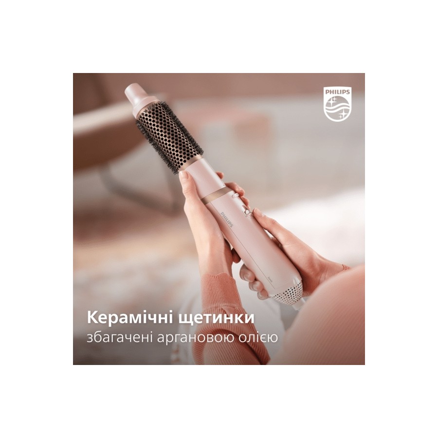 Фен-щітка оснащена керамічними щетинами збагаченими аргановою олією для швидкого та легкого укладання і такого ж шовковистого гладкого ковзання, як і волосся.
