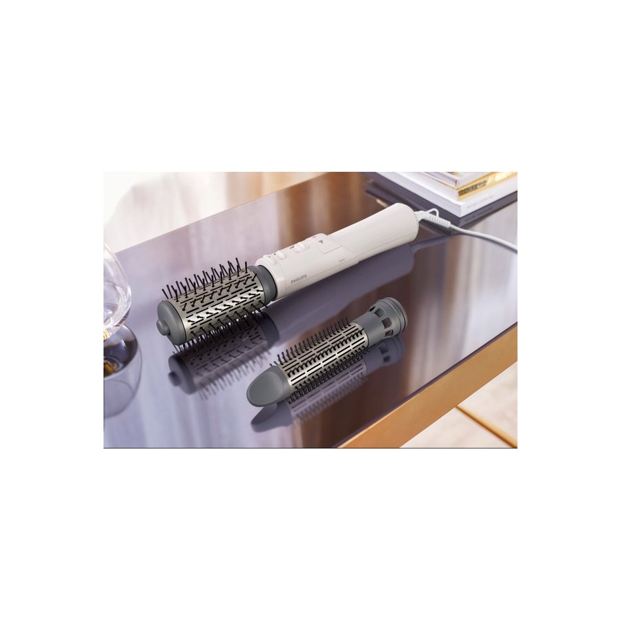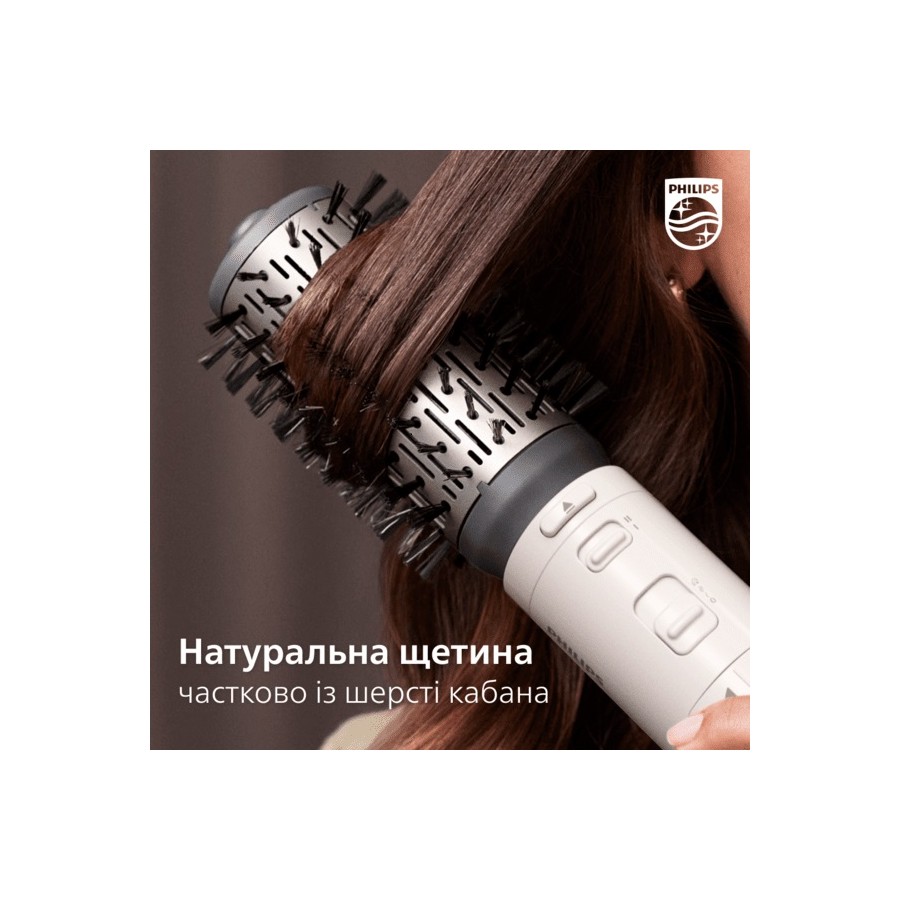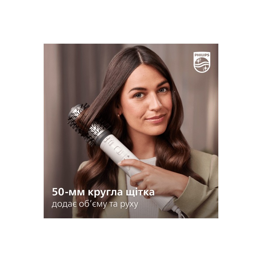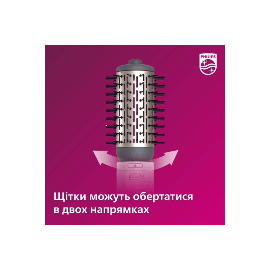 Використовуйте фен-щітку Philips Dynamic Volumebrush для створення різних зачісок зі збереженням гладкості й блиску волосся. Її 50-мм поворотна щітка з натуральною щетиною додає об’єму та пружності, а висувна щітка створює чіткі хвилі без заплутування.