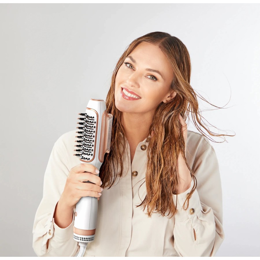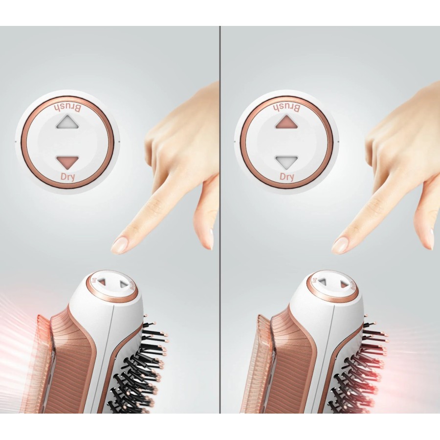Фен і щітка з гарячим повітрям в одному пристрої — таке поєднання створює комфорт під час попереднього сушіння й допомагає легко укладати волосся завдяки щітці з гарячим повітрям.