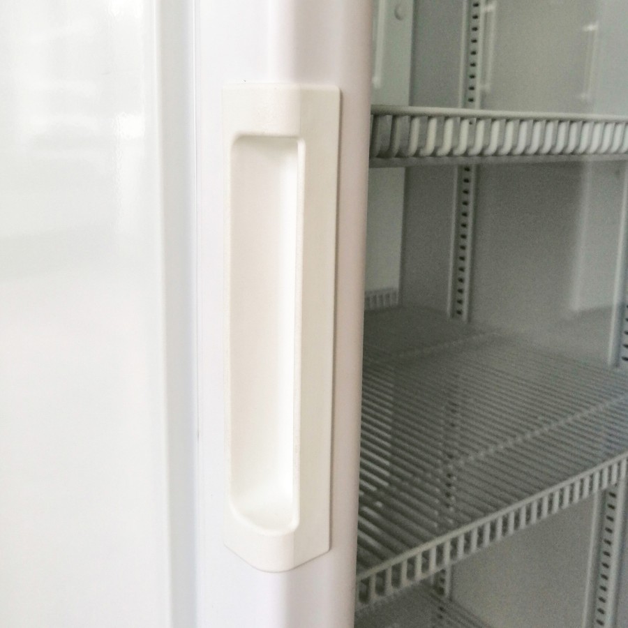 Дизайн вітрини виконаний у білому кольорі, що робить її універсальною для будь-якого інтер’єру. Прозорі двері дозволяють клієнтам легко бачити продукцію, а вбудований рекламний банер привертає увагу та сприяє кращому просуванню товарів.
