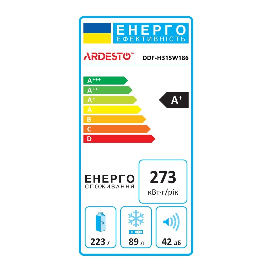 Холодильник ARDESTO DDF-H315W186 виготовлено в елегантному дизайні. Завдяки класичному білому кольору пасуватиме до будь-якої сучасної кухні. Об’єму 312 л (відділення для зберігання свіжих продуктів – 223 л; відділення, марковане чотирма зірочками, – 89 л) достатньо для задоволення потреб невеликої родини. Холодильник оснащено надійним компресором, який оптимізує споживання електроенергії (клас А+) та забезпечує точне підтримання температури в середині камер. Пристрій не спричинить незручностей, адже працює тихо – рівень шуму 42 дБ (А).