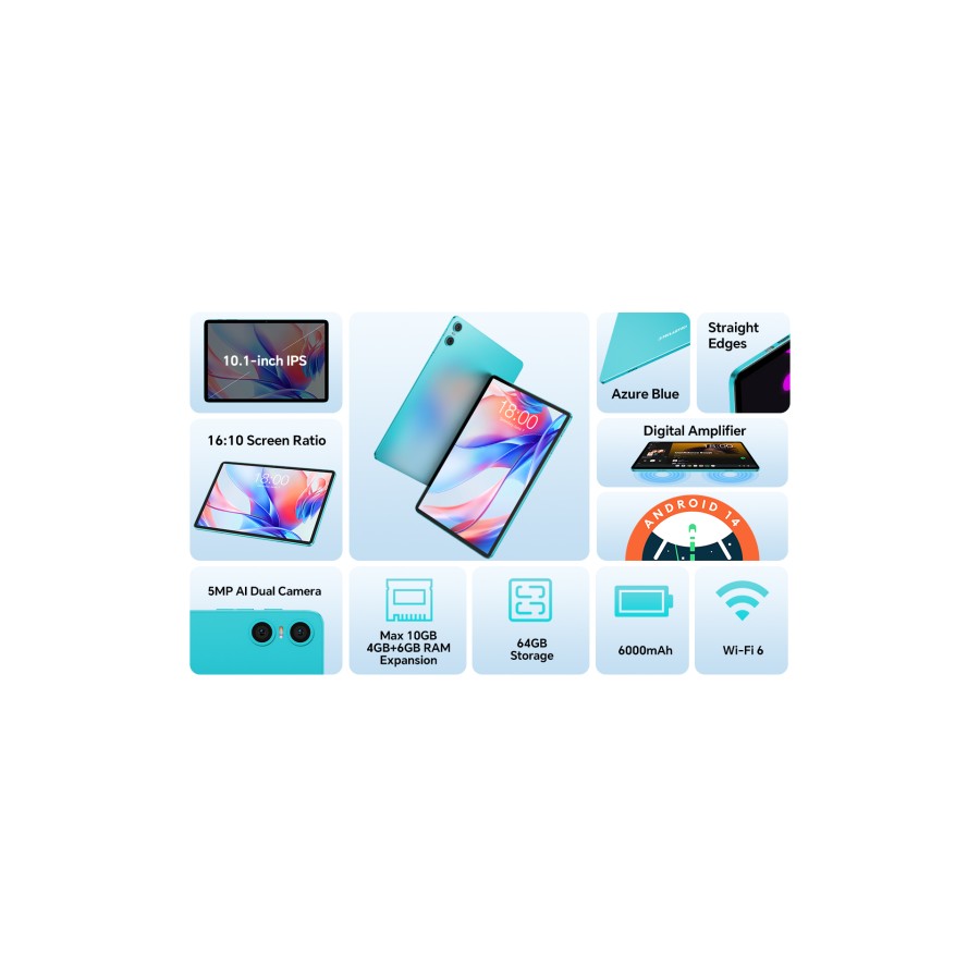 Teclast P30 побудований на 8-ядерному процесорі Allwinner A523 (4x [email protected]ГГц і 4x [email protected]ГГц), який забезпечує достатню продуктивність для більшості повсякденних завдань. Графічний процесор ARM Mali-G57 MC1 2EE з частотою 750МГц забезпечує плавний відео та ігровий досвід на середніх і низьких налаштуваннях графіки. Фізична оперативна пам'ять 4 ГБ LPDDR3 та 6 ГБ віртуальної пам'яті дозволяють планшету виконувати багатозадачні операції, а внутрішня пам'ять об'ємом 64 ГБ розширюється за допомогою карти microSD до 1 ТБ, щоб вирішити всі питання із збереженням улюблених фото і відео.