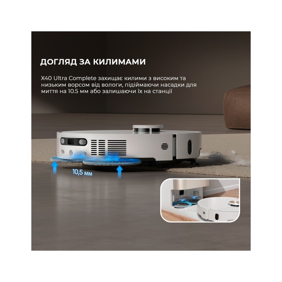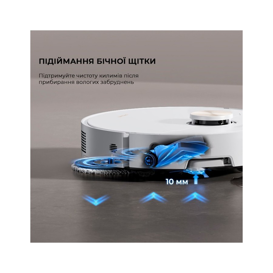 Розумний пилосос автоматично піднімає всі свої насадки, коли заїжджає на килим. Покриття залишається сухим і чистим, навіть якщо перед цим робот щойно робив вологе прибирання.
