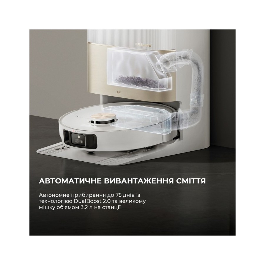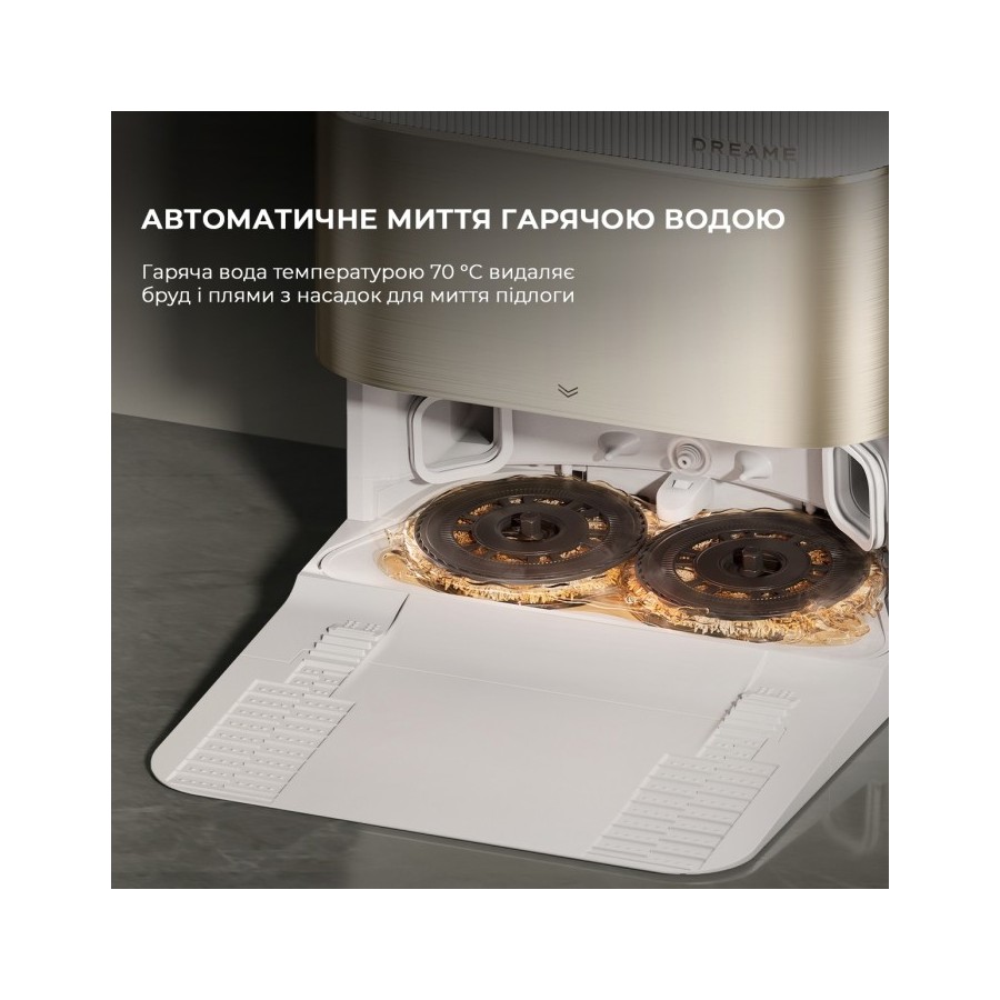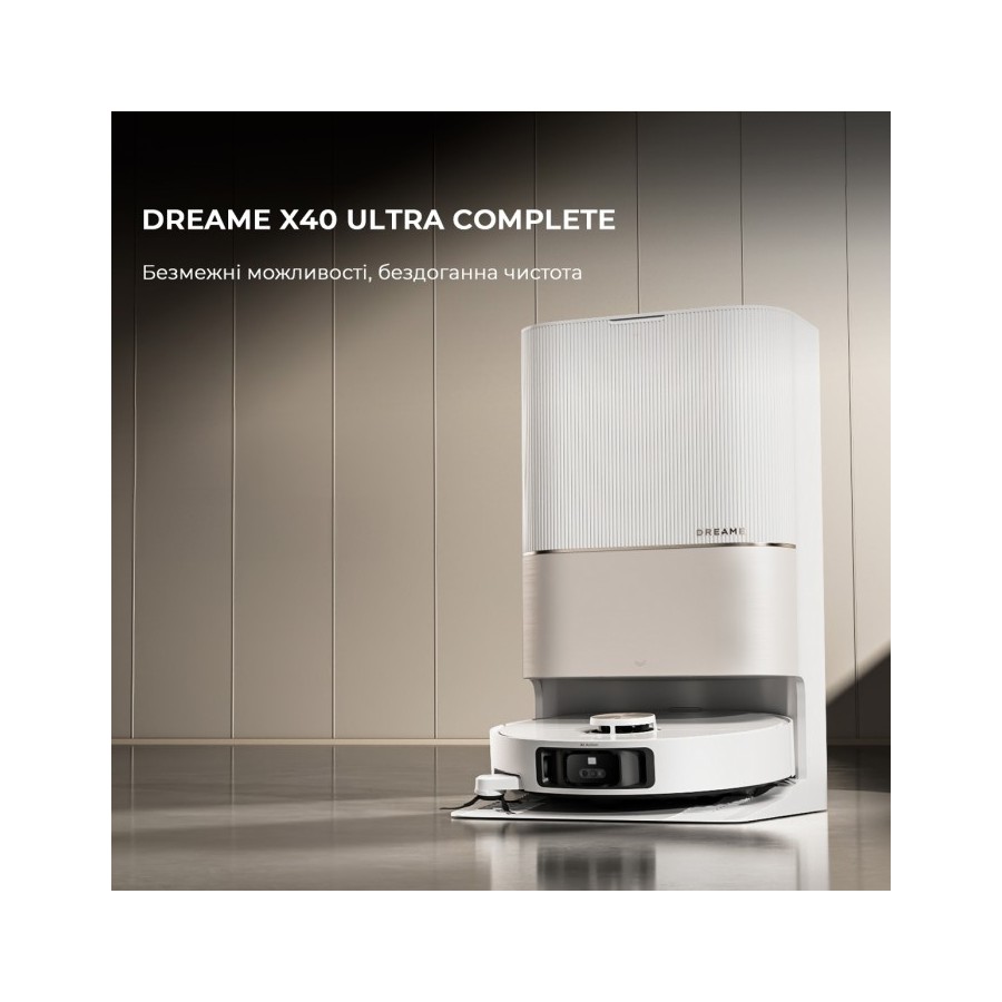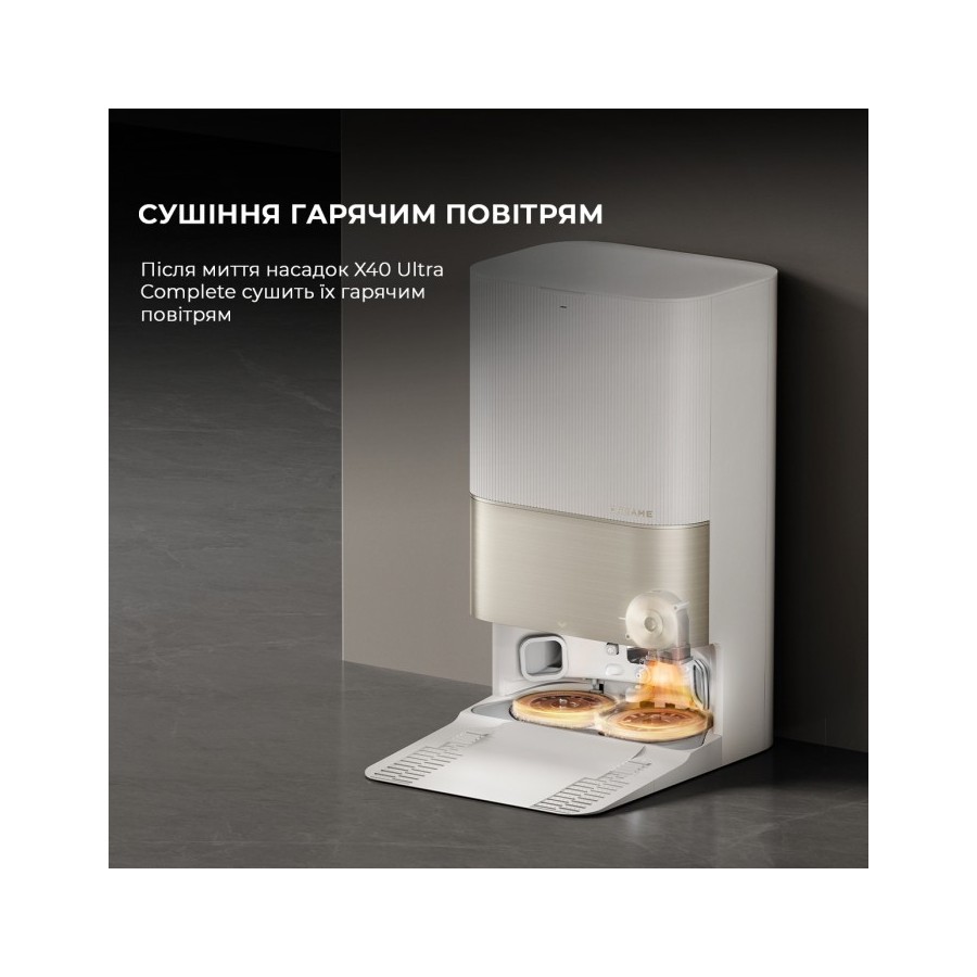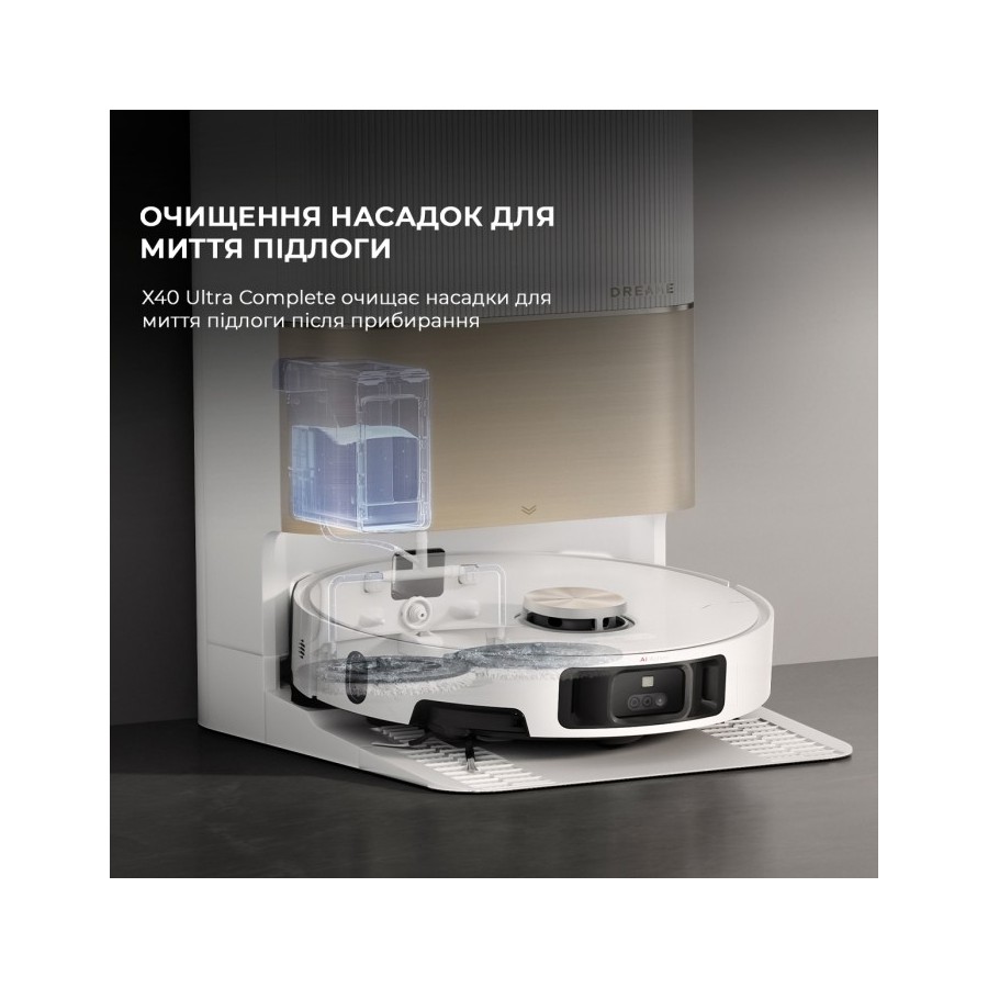 Під час миття підлоги Dreame X40 Ultra Complete White періодично повертається на док-станцію, щоб долити води, миючого засобу та промити насадки. При необхідності він також витрушує сміття з пилозбірника в мішок герметичний на станції. Після завершення збирання він стирає насадки у гарячій воді при температурі 70 °C, а потім висушує їх теплим повітрям. В результаті насадки завжди залишаються сухими та чистими, навіть під час збирання сильних забруднень.