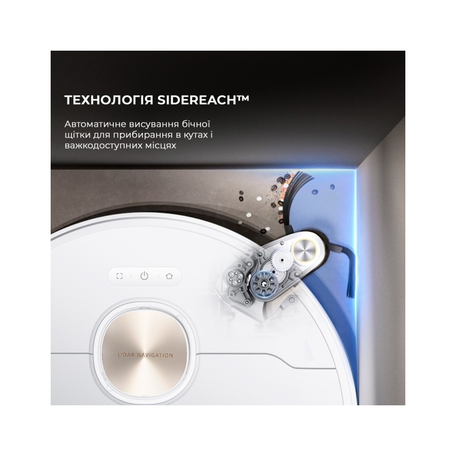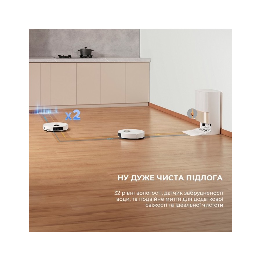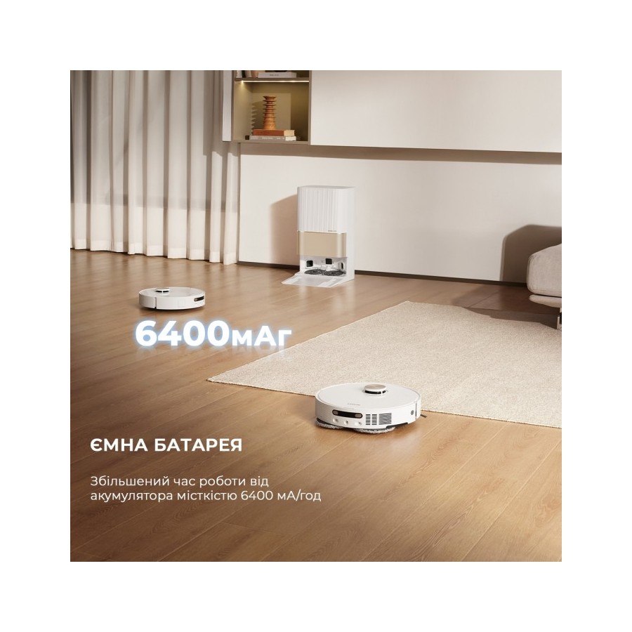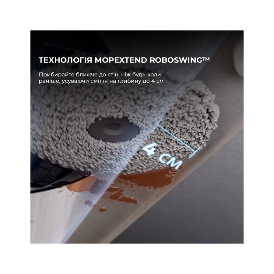 Dreame X40 Ultra Complete White не просто миє підлогу, а натирає його двома обертовими насадками. Одна з них висувається на 4 см для того, щоб помити простір під стінами та навколо меблів. Ця технологія називається MopExtend RoboSwing, і завдяки їй підлога виглядає так, ніби її ретельно помили вручну.