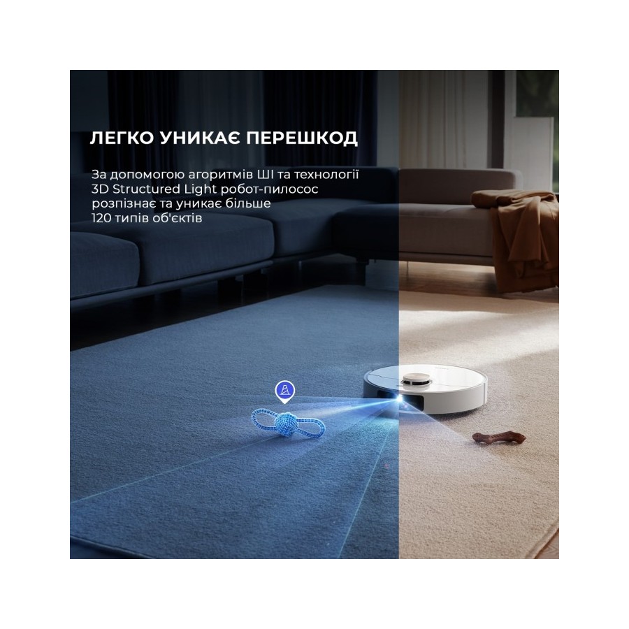 Dreame X40 Ultra Complete White визначає та ідентифікує до 120 видів різних перешкод. Для цього він також використовує інтелектуальну камеру та 3D-сканування об'єктів.