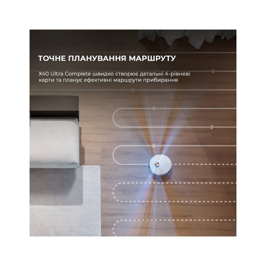 Dreame X40 Ultra Complete White здатний охопити площу 240 м2 та до 4 поверхів будинку. Для кожного з них він створює та запам'ятовує детальні карти. Точно побудувати маршрут роботу допомагає датчик LIDAR та додаткові датчики розпізнавання перешкод.