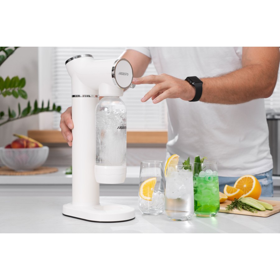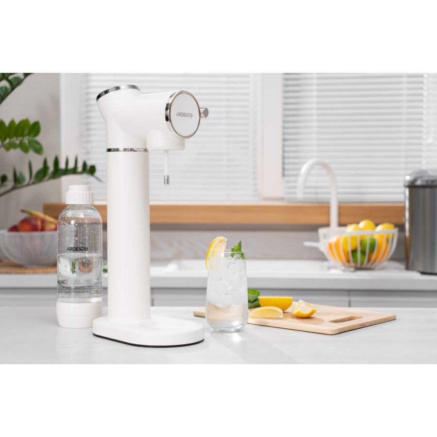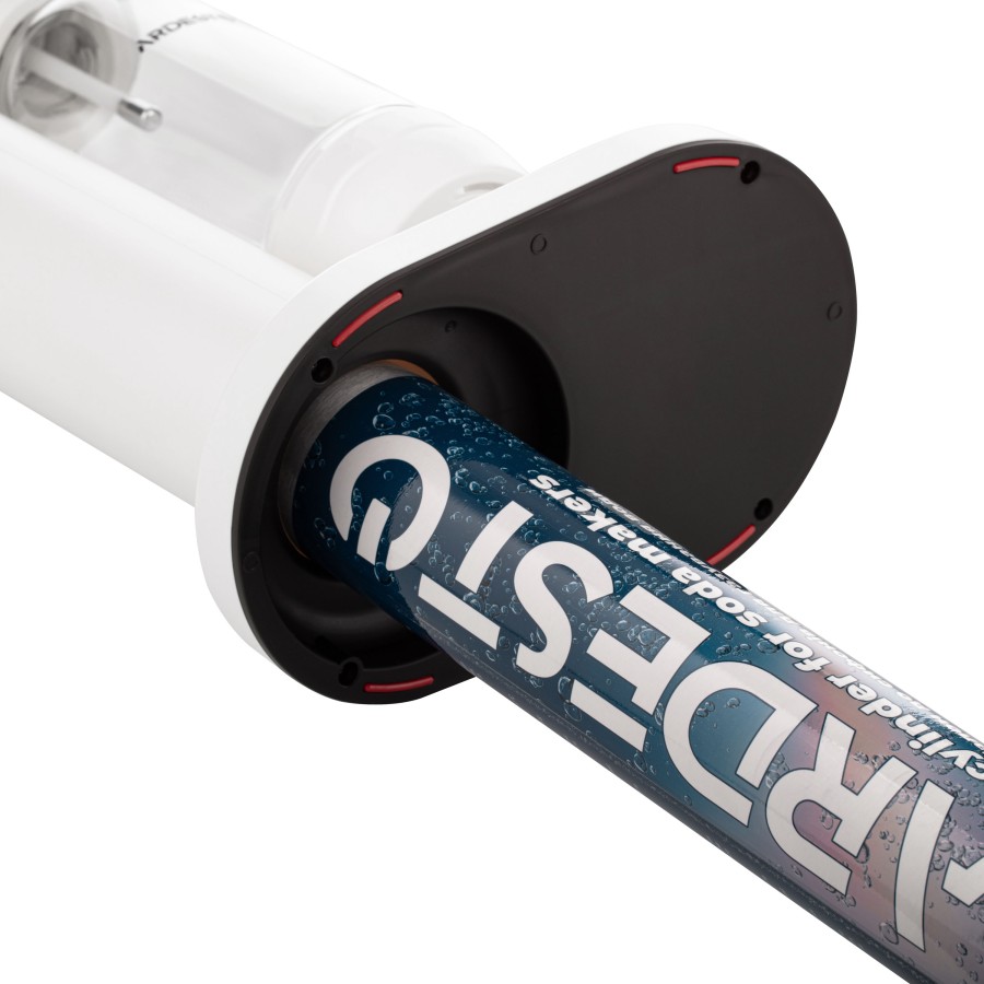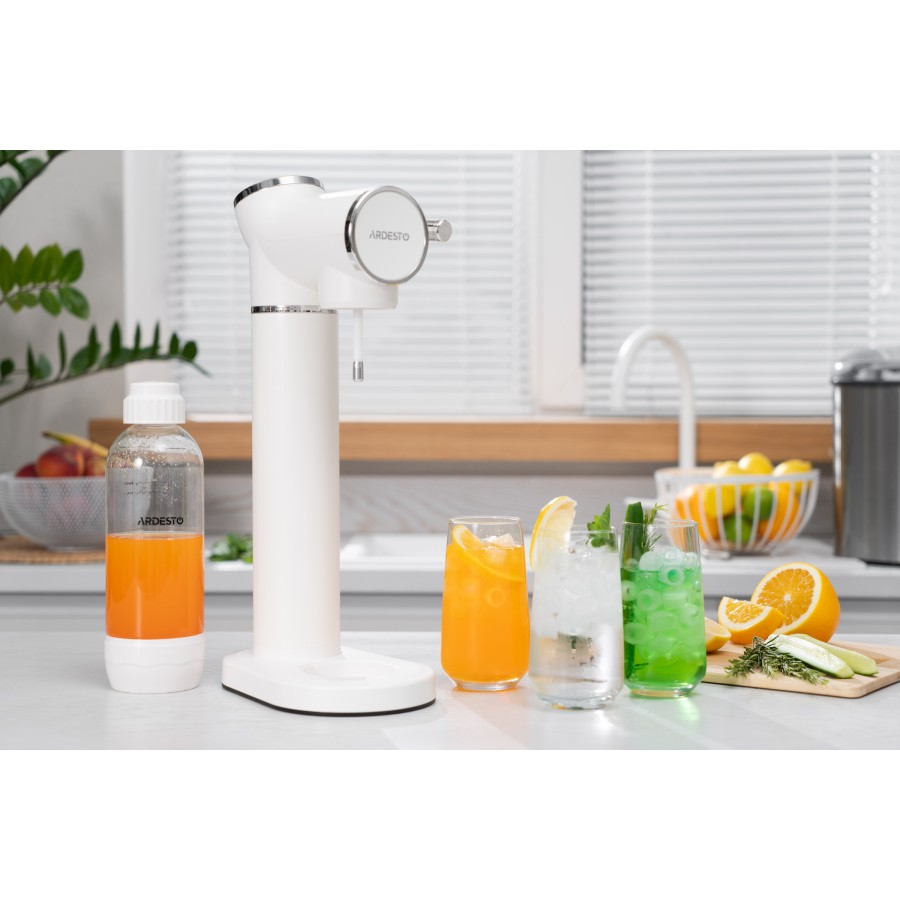 Сумісний із більшістю газових балонів для сифонів із гвинтовим кріпленням. Надійний і безпечний механізм фіксації газового балона та пляшок, а також унікальна система клапанів, забезпечують максимальну герметизацію. Корпус виготовлено з екологічних і корозійностійких матеріалів. У комплекті надається пляшка для газування об’ємом 1 л.