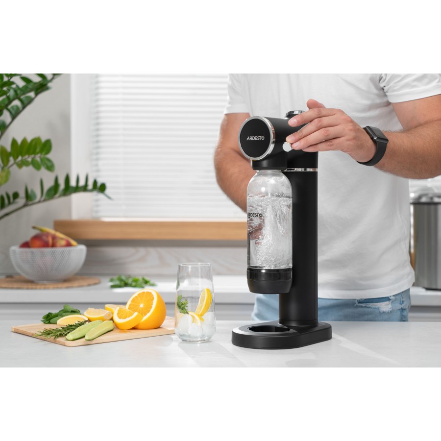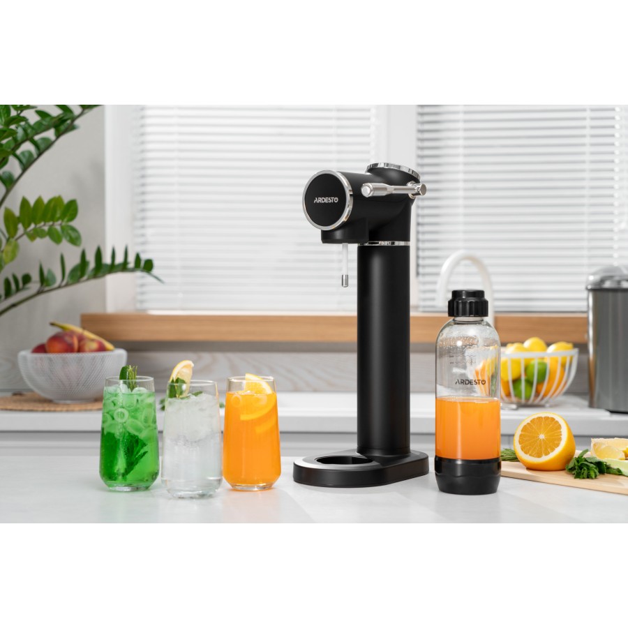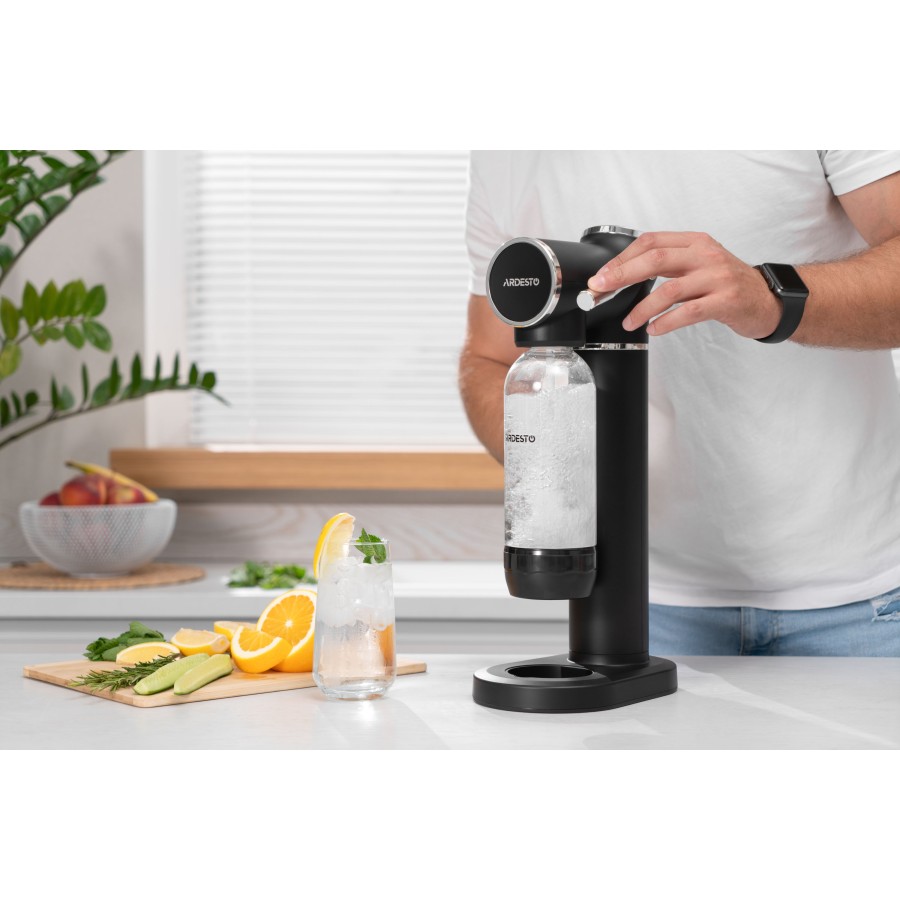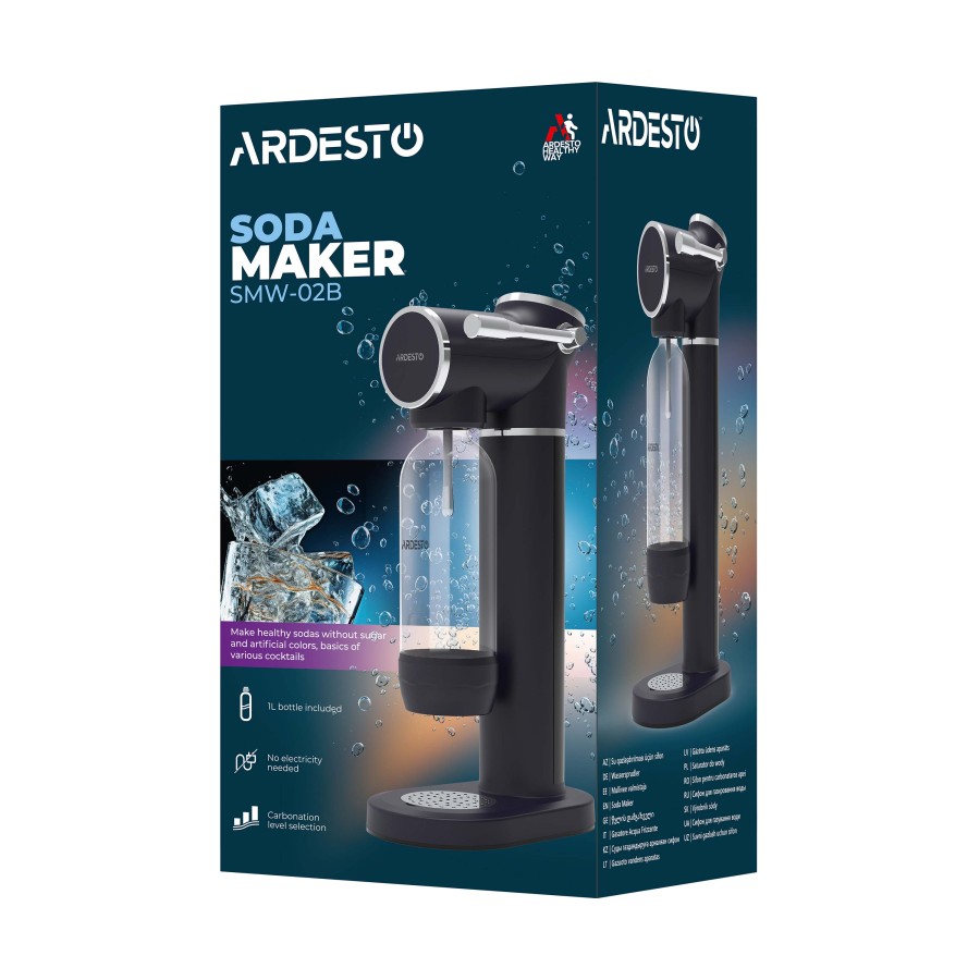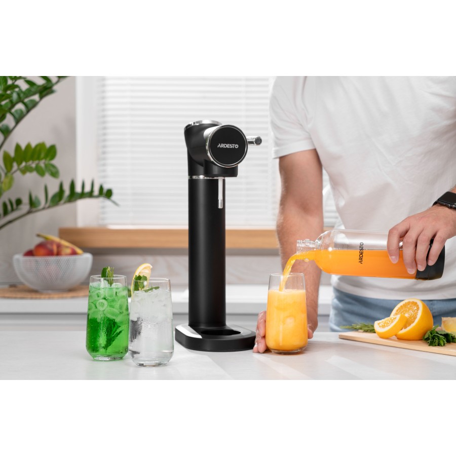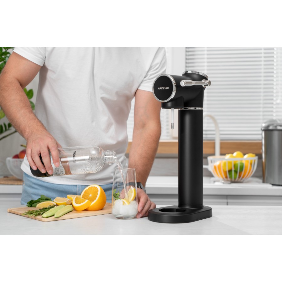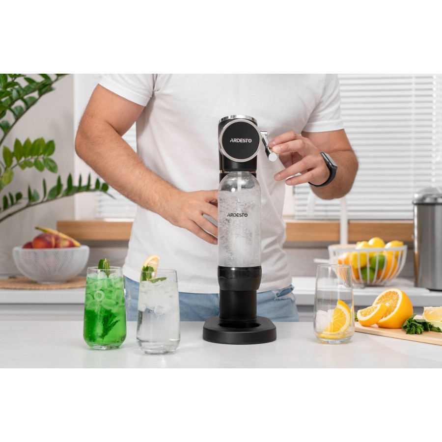 Сумісний із більшістю газових балонів для сифонів із гвинтовим кріпленням. Надійний і безпечний механізм фіксації газового балона та пляшок, а також унікальна система клапанів, забезпечують максимальну герметизацію. Корпус виготовлено з екологічних і корозійностійких матеріалів. У комплекті надається пляшка для газування об’ємом 1 л.