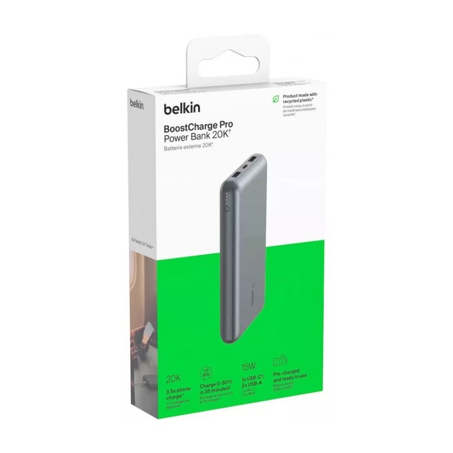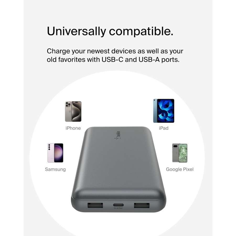 Belkin Power Bank BPB012BTGY із ємністю 20000 мА·год — це потужний і зручний портативний акумулятор, який забезпечить ваші гаджети енергією протягом усього дня. Завдяки великій ємності пристрій може кілька разів заряджати смартфони, планшети або інші портативні пристрої, що робить його ідеальним для подорожей або тривалих робочих днів.