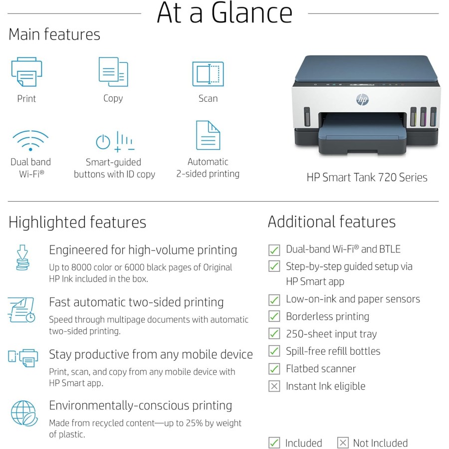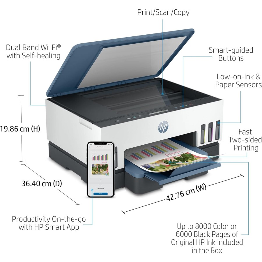 HP Smart Tank 725 (28B51A) — це багатофункціональний струменевий принтер із резервуарною системою подачі чорнил, що забезпечує виняткову якість друку при мінімальних витратах. Завдяки поєднанню передових технологій та інтуїтивно зрозумілого інтерфейсу, цей пристрій стане надійним помічником для дому, навчання або бізнесу.