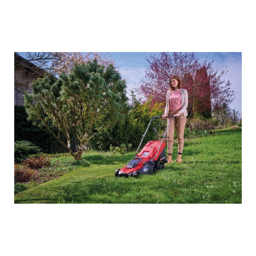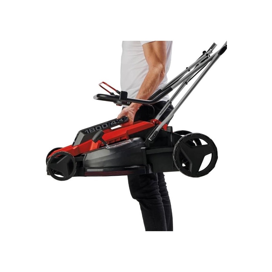Газонокосарка Einhell GC-EM 1800/43 має ширину зрізу 43 см та 6-ступінчасте осьове регулювання висоти стрижки, висота зрізу може бути попередньо обрана від 20 до 65 мм. Ергономічна ручка може бути скоригована до кожного користувача за допомогою простих налаштувань для особливо ергономічної роботи. Електрична газонокосарка рекомендується для безперервного косіння газонів площею до 800 м². Кабельний затискач для кріплення кабелю дозволяє зняти натяжіння та захищає кабель живлення від зношування та пошкоджень. Широкі колеса зберігають газон та полегшують роботу у важкодоступній місцевості. 50-літровий травозбірник забезпечує простір для великих робіт, необхідність очищення можна побачити завдяки індикатору рівня. Корпус та травозбірник 50 л виготовлені з ударостійкого пластику високої якості. Газонокосарка Einhell GC-EM 1800/43 оснащена складною, довгою ручкою, яка дозволяє зберігати у складеному вигляді газонокосарку у мінімальному просторі. Для зручності перенесення є вбудована ручка.