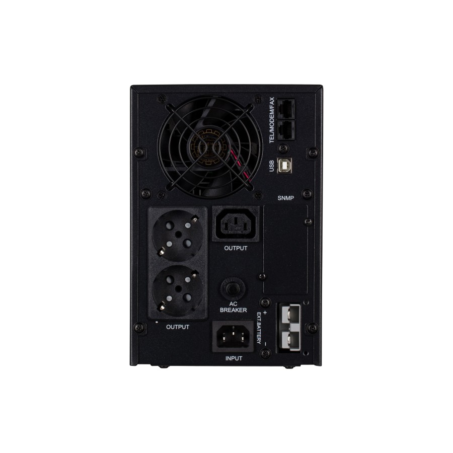 Вхід 165 ~ 300 В змінного струму, на виході «чиста» синусоїда 220/230/240 В (можливість налаштування напруги). Дві розетки Schuko + 1 розетка IEC C13, кабель живлення, кабель для підключення зовнішніх АКБ, розніми USB та RJ45. На передній панелі вбудовано LCD-дисплей, на якому відображається стан роботи пристрою, зокрема коди помилок.