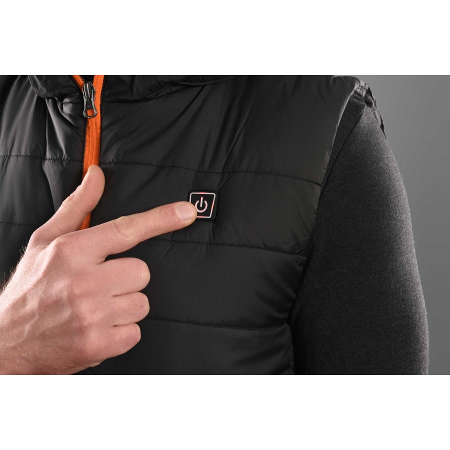 Три нагрівальні елементи з вуглецевого волокна надійно приховані під внутрішньою підкладкою: один вшито посередині на спинці виробу, а інші два – під кишенями спереду. У такий спосіб створюється широка зона обігріву та забезпечується рівномірний розподіл тепла. До того ж нагрівання саме цих визначених зон сприятливо впливає на кровообіг. Нагрівальні елементи міцні, довговічні та витримують велику кількість вигинів. Доступні три температурні режими (високий, середній і низький), які легко регулювати натисканням кнопки (вмикаються почергово).