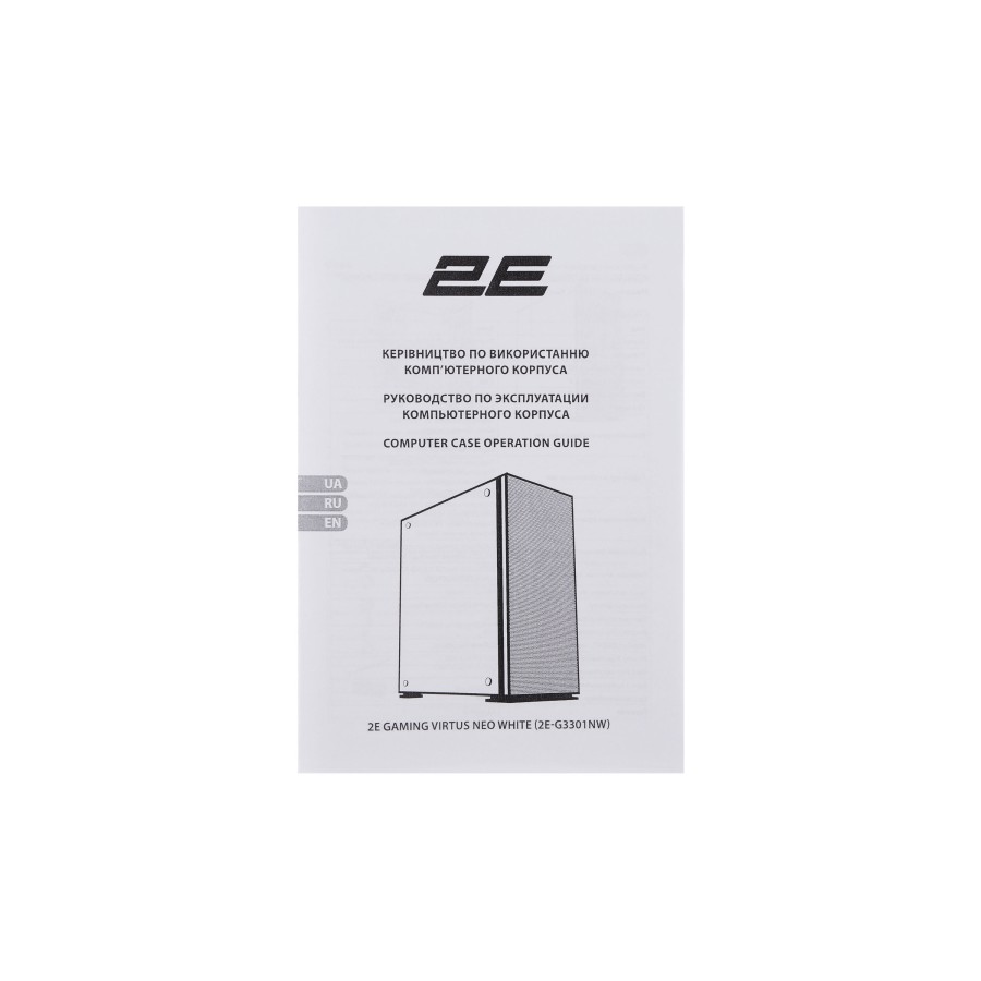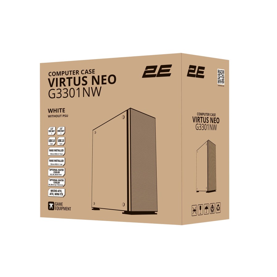 Корпус 2E GAMING Virtus Neo G3301NW підходить для збірки домашнього ПК і потужної ігрової системи, має стильний дизайн і активну вентиляцію. Максимально можлива довжина відеокарти – 340 мм. Корпус надає можливість монтажу достатньої кількості накопичувачів і багаточисельних плат розширення (7 слотів розширення). Передбачена установка 6-ти вентиляторів (на верхню панель, до вже чотирьох встановлених) і охолодження для процесора висотою до 178 мм. Корпус адаптований для можливості монтажу системи рідинного охолодження на передній панелі – радіатори 120/240мм, на задній – один 120мм і на верхній – радіатори 120/240мм, додатково передбачено простір для зручного розміщення кабелів. На верхній панелі розміщений пиловий магнітний фільтр, додатково стандартний пиловий фільтр на нижній панелі.