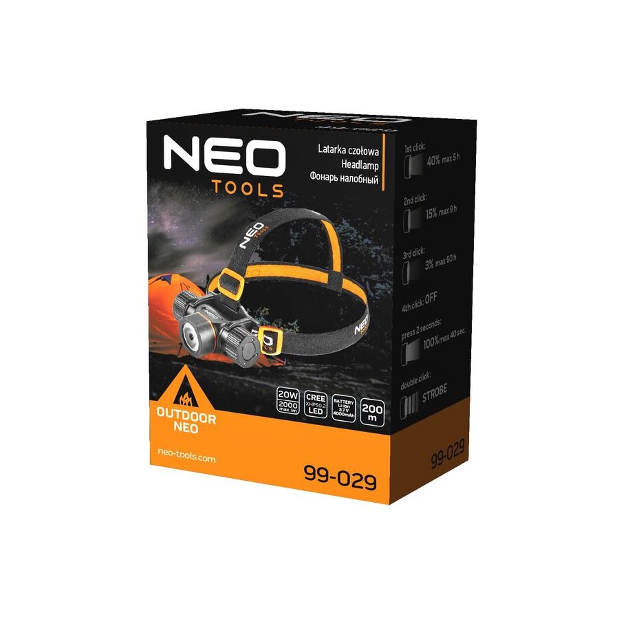 Потужний (2000 люмен) налобний ліхтар NEO оснащений висококласним світлодіодом LED CREE XP50.2 потужністю 20Вт. Корпус виконаний із алюмінію. Ліхтар має 5 функцій освітлення 100%/40%/15%/3%/стробоскоп. Фару можна зняти з корпусу та використовувати як ліхтарик. Ліхтар поставляється із обручем на голову. Має широкий спектр застосування, у тому числі в майстерні, для електрика, сантехніка, у поході, під час поїздок, під час занять спортом тощо. Відповідність європейським стандартам безпеки підтверджено сертифікатом CE.