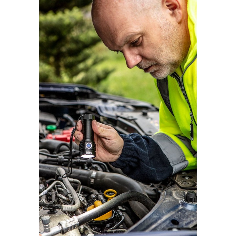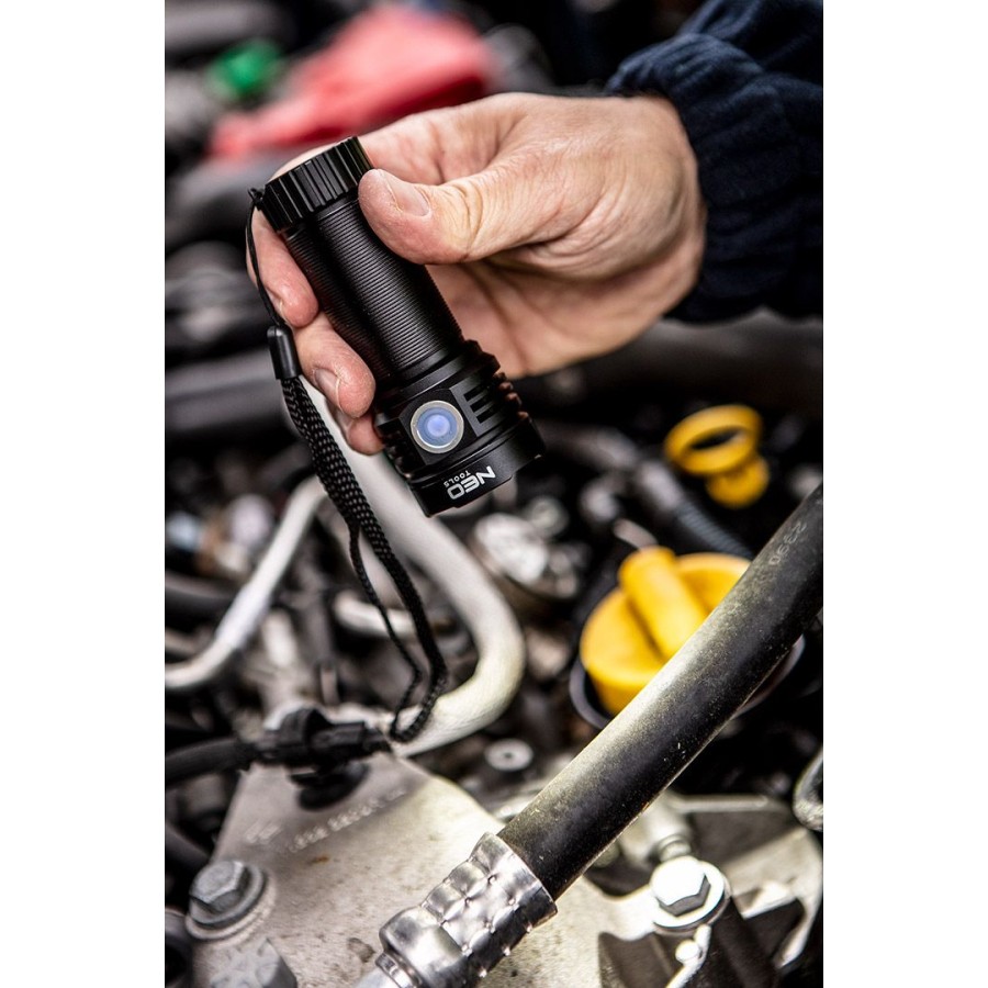 Ліхтар NEO відрізняється міцною конструкцією, корпус виконаний із алюмінію. Він оснащений світлодіодом LED OSRAM P9 LED зі світловим потоком 3300 люмен та потужністю 30Вт. Ліхтар має 5 функцій освітлення: ліхтар 100% / ліхтар 40% / ліхтар 10% / ліхтар 3% / стробоскоп. Продукт має широкий спектр застосування, наприклад, вдома, в машині, у підвалі, кемпінгу. Відповідність європейським стандартам безпеки підтверджується сертифікатом CE.