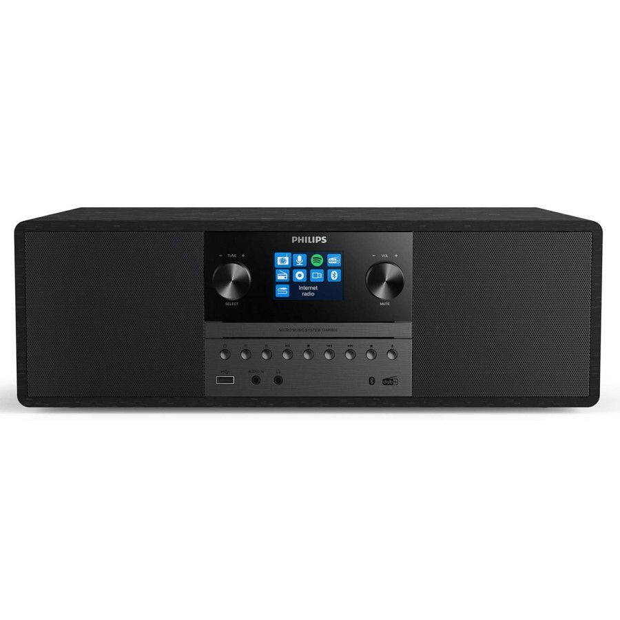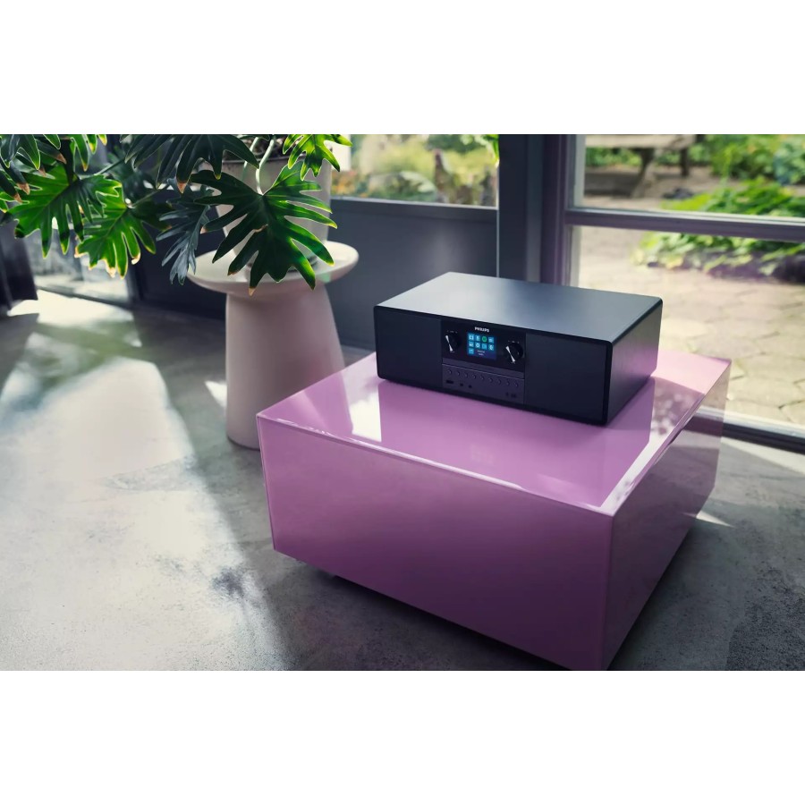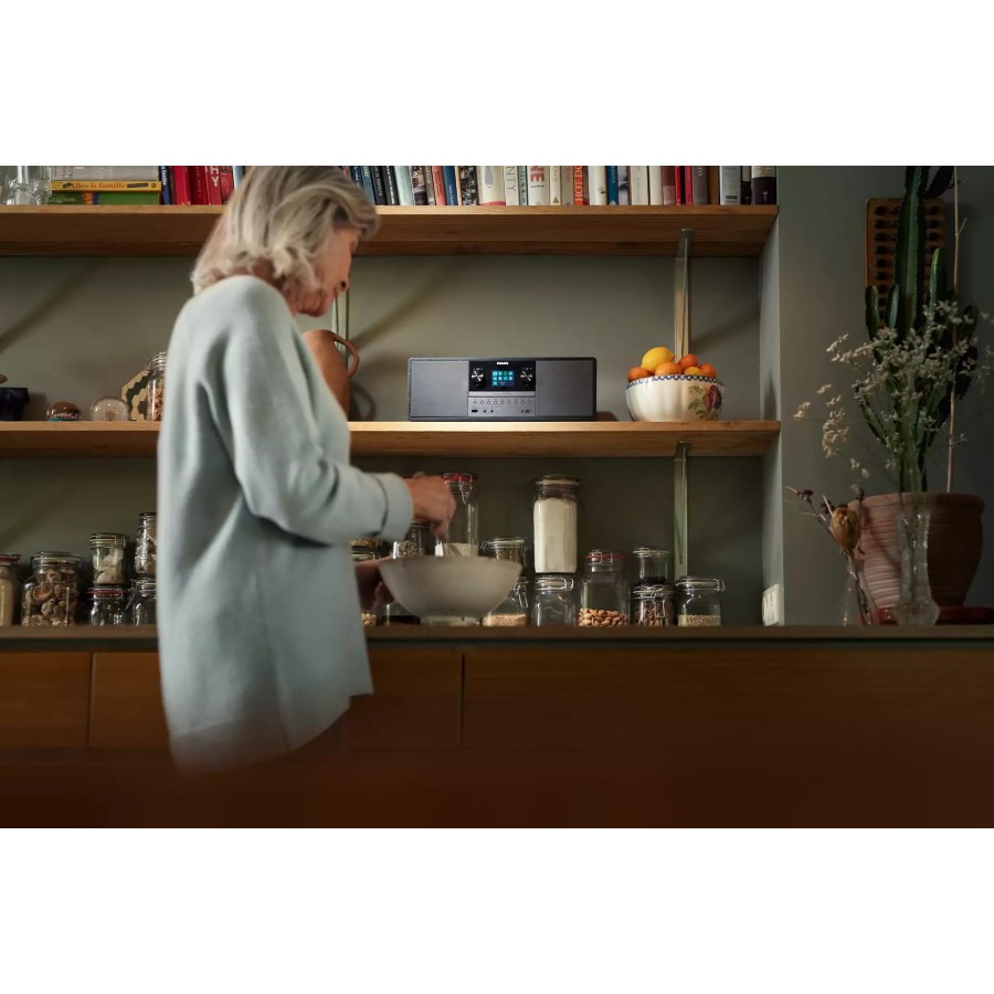 Ця мікросистема з живленням від мережі змінного струму буде чудово виглядати в будь-якому інтер'єрі. Радіус дії бездротового підключення Bluetooth становить 10 метрів, а USB-порт дозволяє заряджати мобільний пристрій. Простий у використанні пульт дистанційного керування дозволяє легко налаштовувати функції.