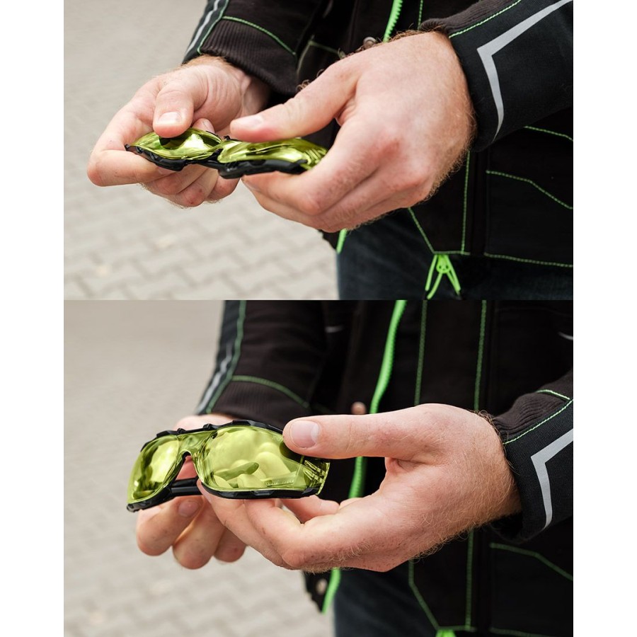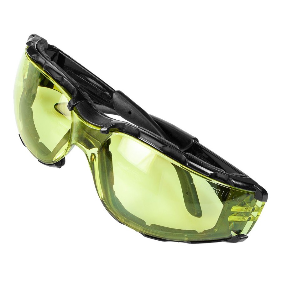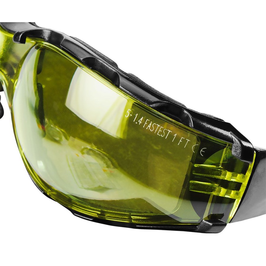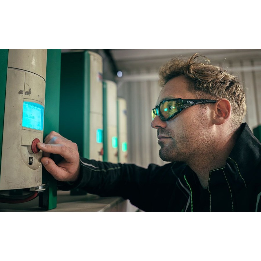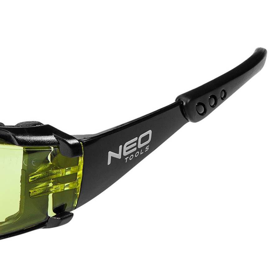 Захисні окуляри NEO мають УФ-фільтр 5-1,4-, що забезпечує захист від ультрафіолетового випромінювання. Жовті лінзи, які гарантують краще розпізнавання кольорів, виготовлені з полікарбонату, а нековзні дужки - з гуми. Пінопластова вставка впливає на краще прилягання окулярів до обличчя і комфорт при носінні. Захисні окуляри марки NEO відповідають сертифікату CE EN166. Вони будуть незамінні під час виконання різних завдань, де захист очей має вирішальне значення.