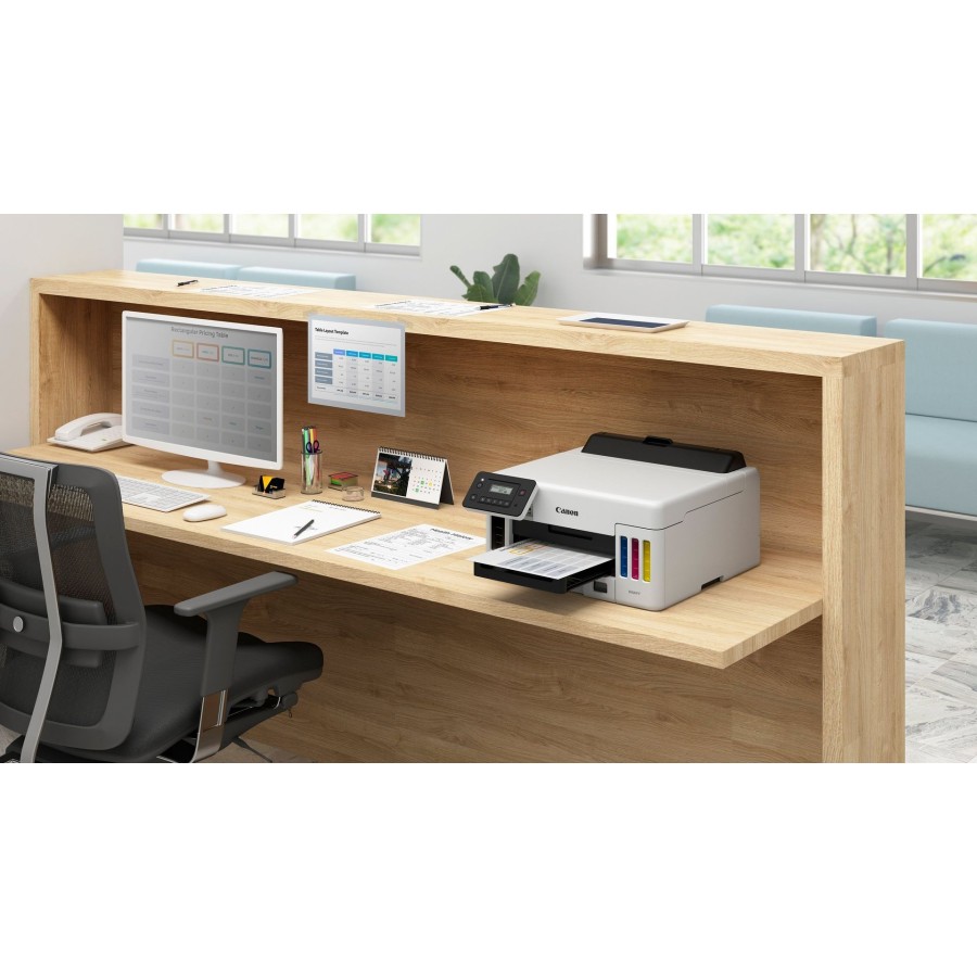 Роздільна здатність друкованої головки досягає 1200x600 dpi. Кольоровий струменевий принтер із СНПЧ Canon MAXIFY GX5040 використовує контейнери збільшеного об'єму. У цій моделі передбачено чотири ємності системи безперервної подачі чорнила. Ресурс чорно-білої фарби складає близько 6000 сторінок, а кольорове чорнило розраховане на роздрук 14 000 сторінок.