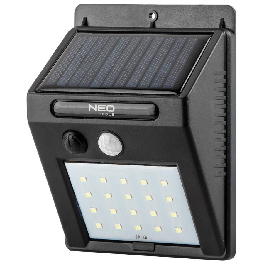 Прожектор Neo Tools, живлення від сонячного світла, 250 люмен, 1200 мАг, 3.7 Li-Ion, SMD LED, датчик руху та сутінків, IP44. Практичний та екологічний настінний світильник Neo Tools, 99-055 на сонячних батареях. Оснащений світлодіодом SMD 250 люмен. Пристрій має практичний датчик руху, що працює на відстані до 10 метрів та з кутом захоплення 120 градусів. Це дуже зручне рішення для людей, яким світло потрібне лише тоді, коли хтось знаходиться зовні. Для освітлення простору біля будинку, воріт, гаража, тераси, майстерні. Пристрій має вбудований літій-іонний акумулятор ємністю 1250 мАг і напругою 3,7 В. Для повної зарядки потрібно 5 годин і він здатний працювати на ньому ще 12 годин. Завдяки функції IC запобігає перезарядженню або розрядженню лампи. Висока якість та безпека підтверджується, зокрема, Європейський сертифікат CE. Ступінь захисту IP44.