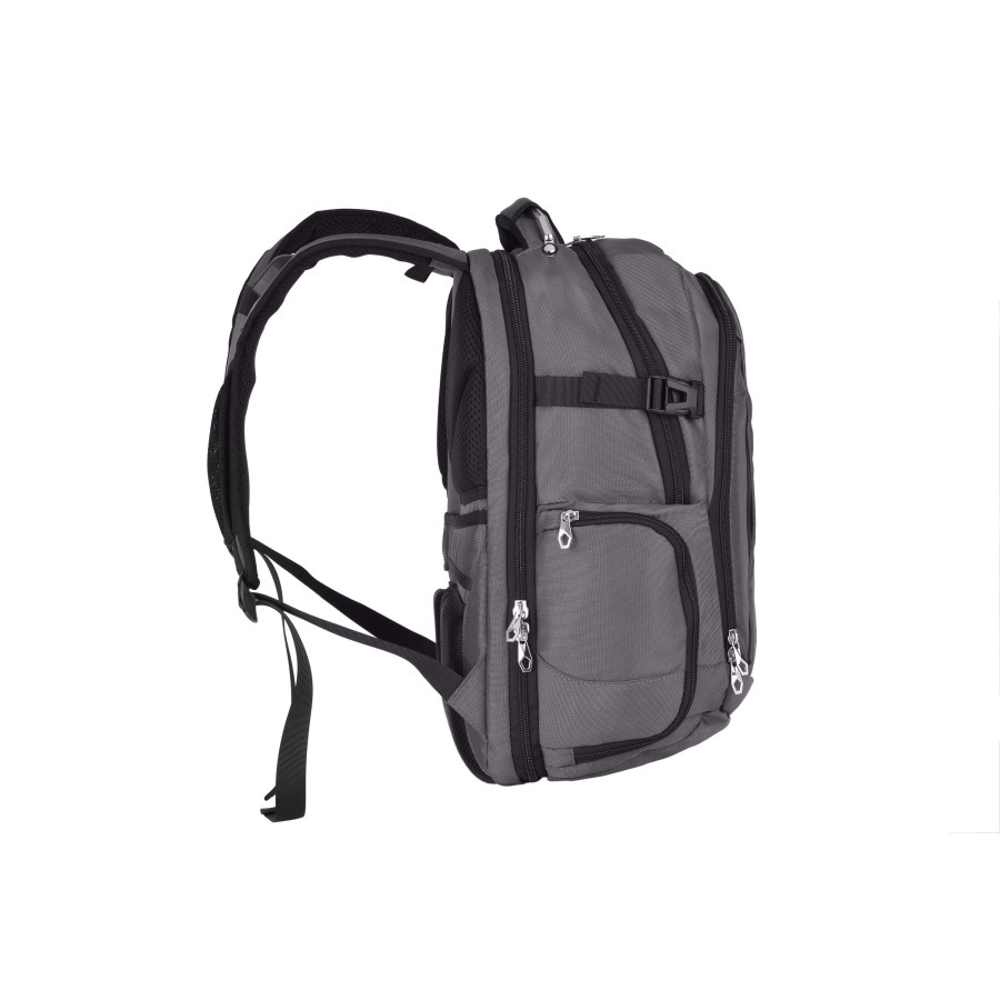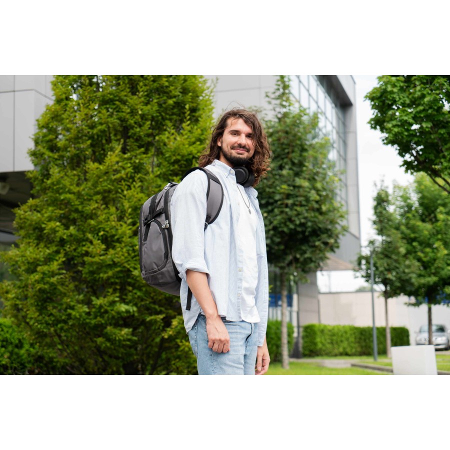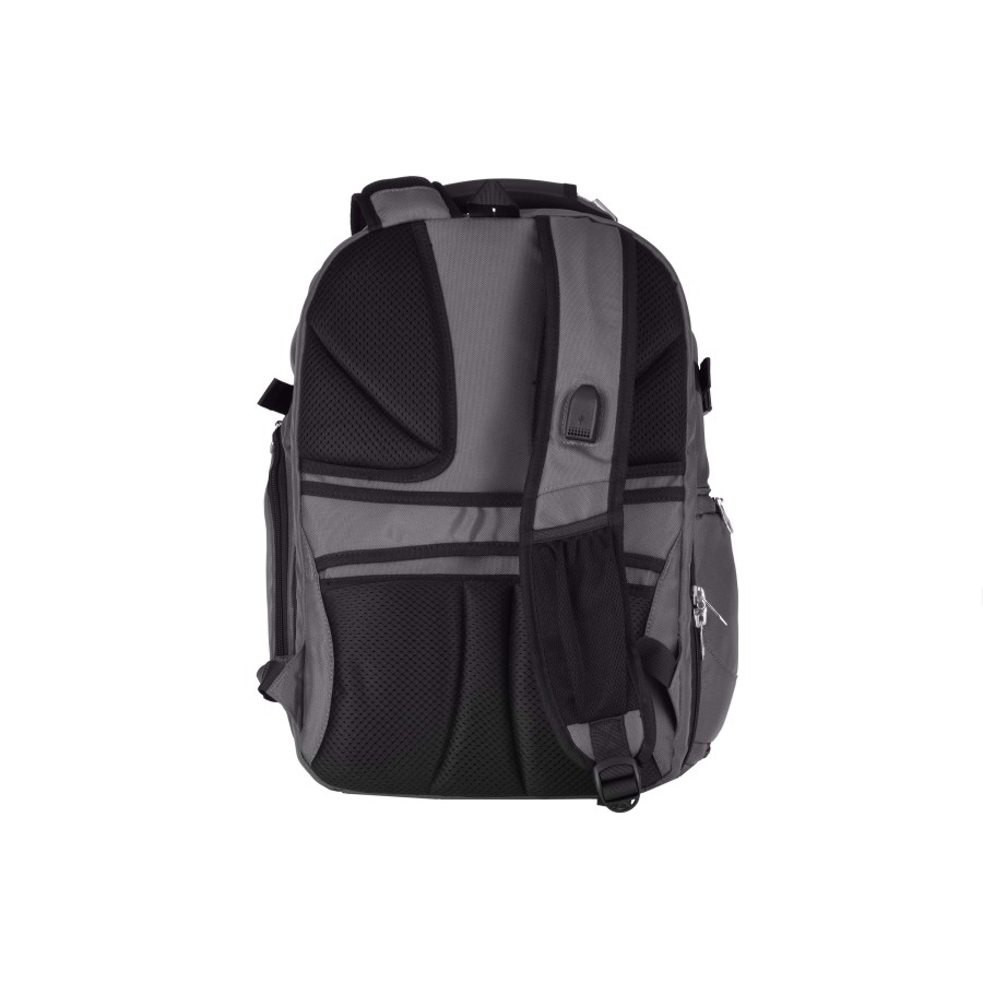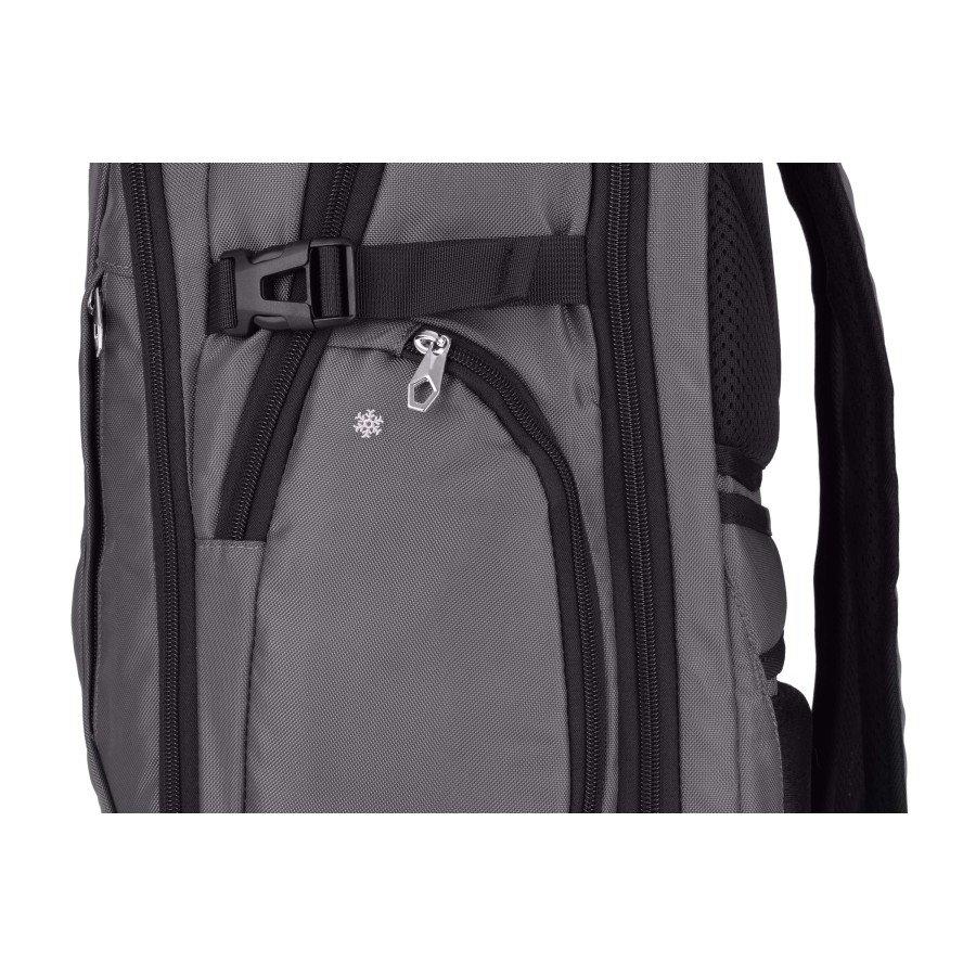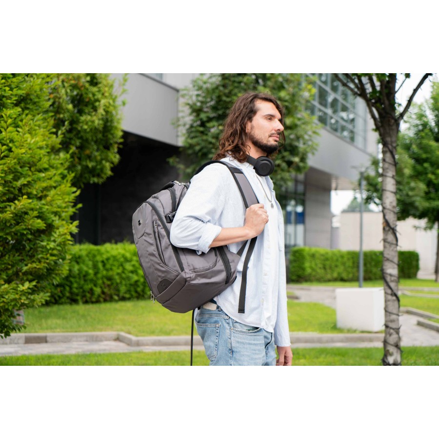Одна з головних особливостей моделі – продумана конструкція. Відділення для ноутбука розгортається на 180º, зокрема це зручно під час проходження митного контролю в аеропортах. Стінки кишені для лептопа мають м’який наповнювач для кращого захисту вмісту, а також фіксувальний пасок на липучці. У тому ж відділенні передбачено відокремлену захищену кишеню для планшетів до 13″, кишеню для повербанка та кабель для заряджання, який виведено в ліву плечову лямку.