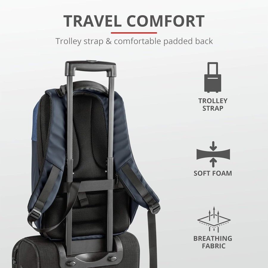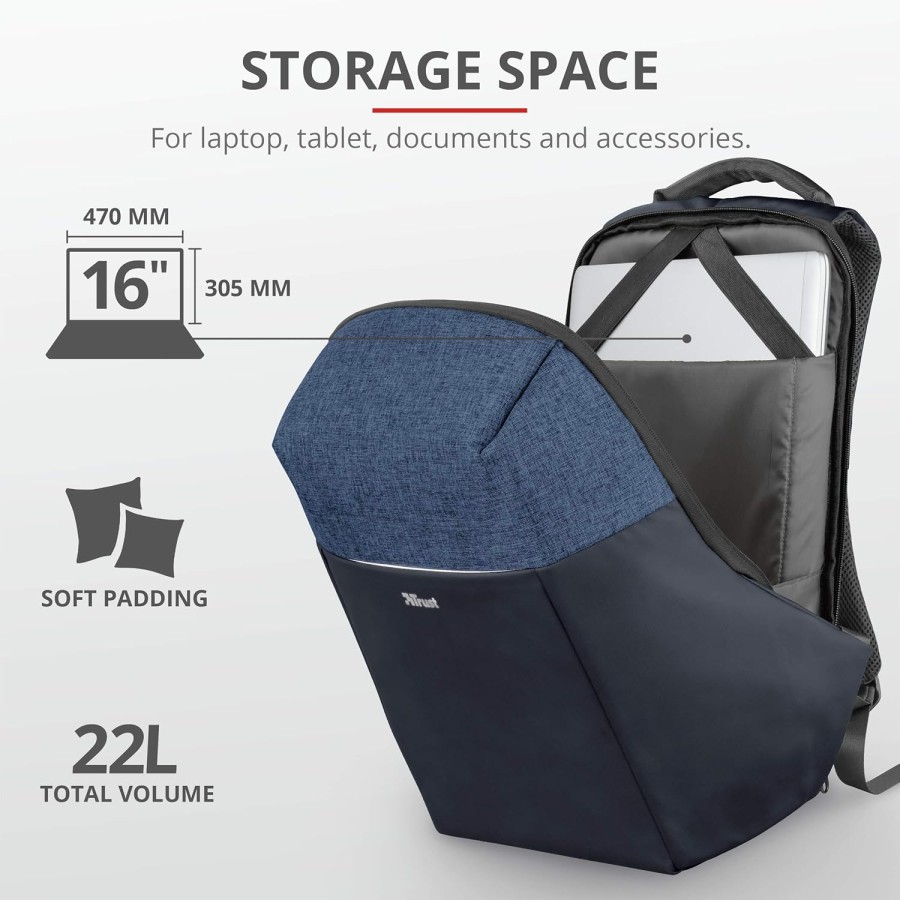 Дизайн Trust Nox орієнтований на комфорт: м’які регульовані плечові ремені, дихаюча спинка та легка вага роблять його зручним навіть під час тривалого носіння. Матеріал із водовідштовхувальними властивостями захищає ваші речі від дощу та вологи, що особливо важливо в міських умовах або під час подорожей.