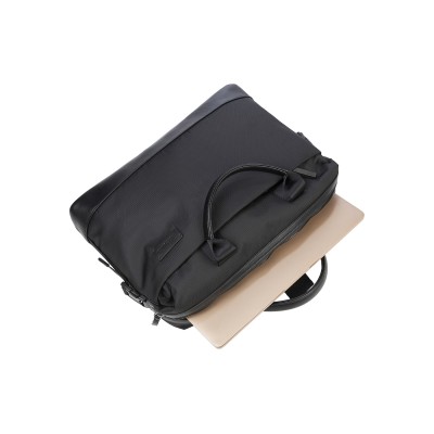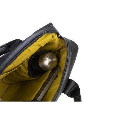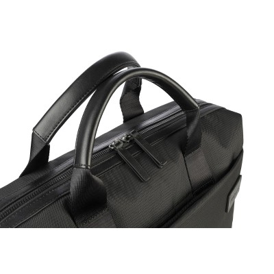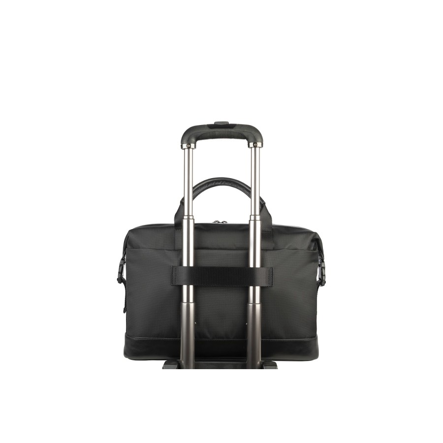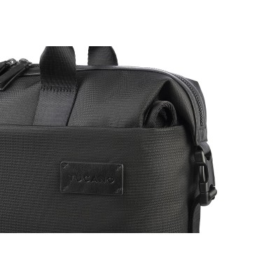 Ділова сумка з тканини, виготовленої з переробленого пластику, має деталі оздоблення з натуральної шкіри. Внутрішнє відділення з захисною кишенею для ноутбуків 15.6/16" або MacBook Pro 16". Широкий верхній отвір з легким доступом, (ширина отвору регулюється з обох боків за допомогою бічних ремінців і фіксується карабінами фасткес). Сумка Tucano Modo Premium 16 має добре організований внутрішній простір та кишеню для аксесуарів на передній частині. На зворотній стороні сумки інтегровано пасок-кріплення для розміщення та фіксації сумки на телескопічній ручці валізи.