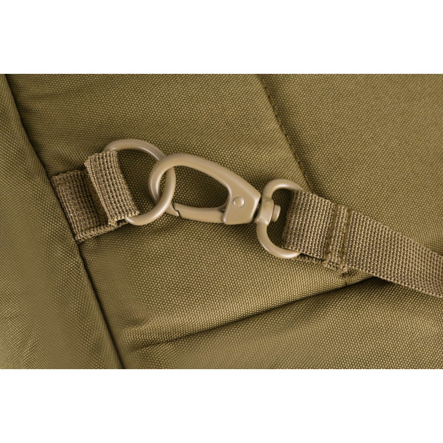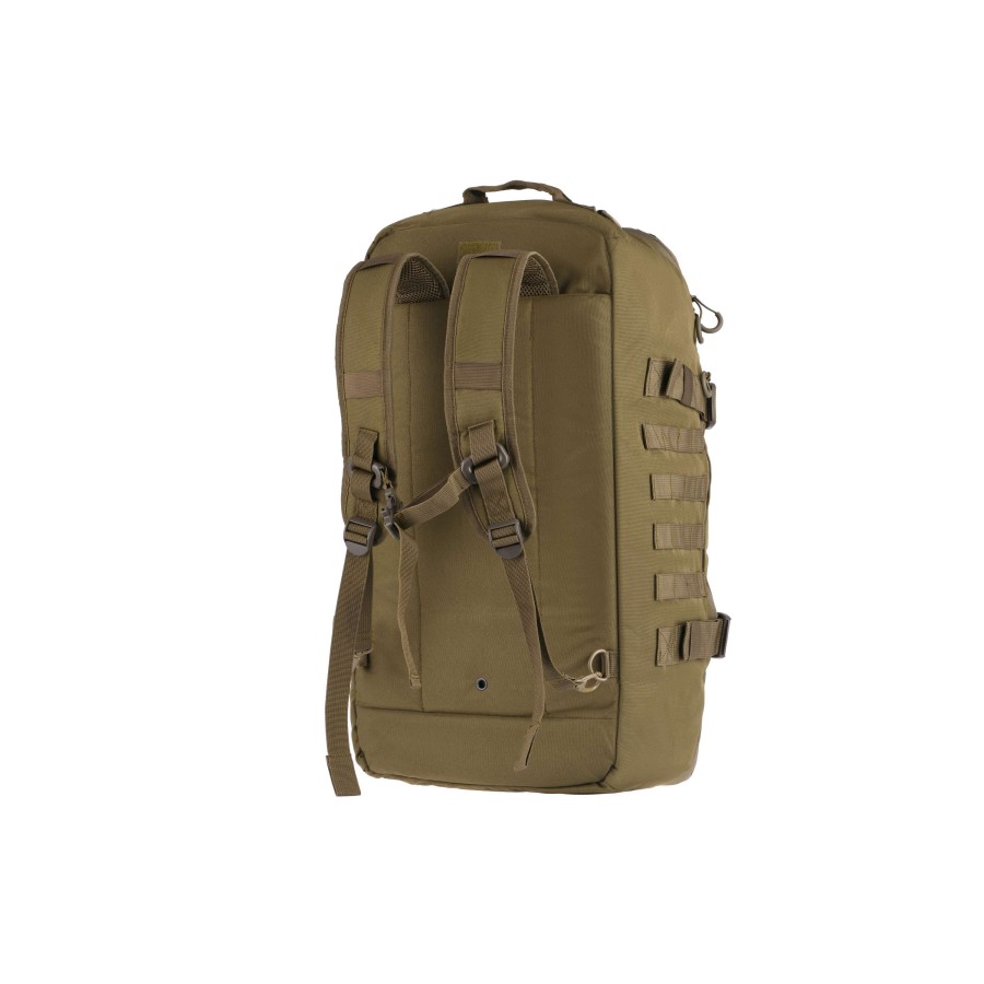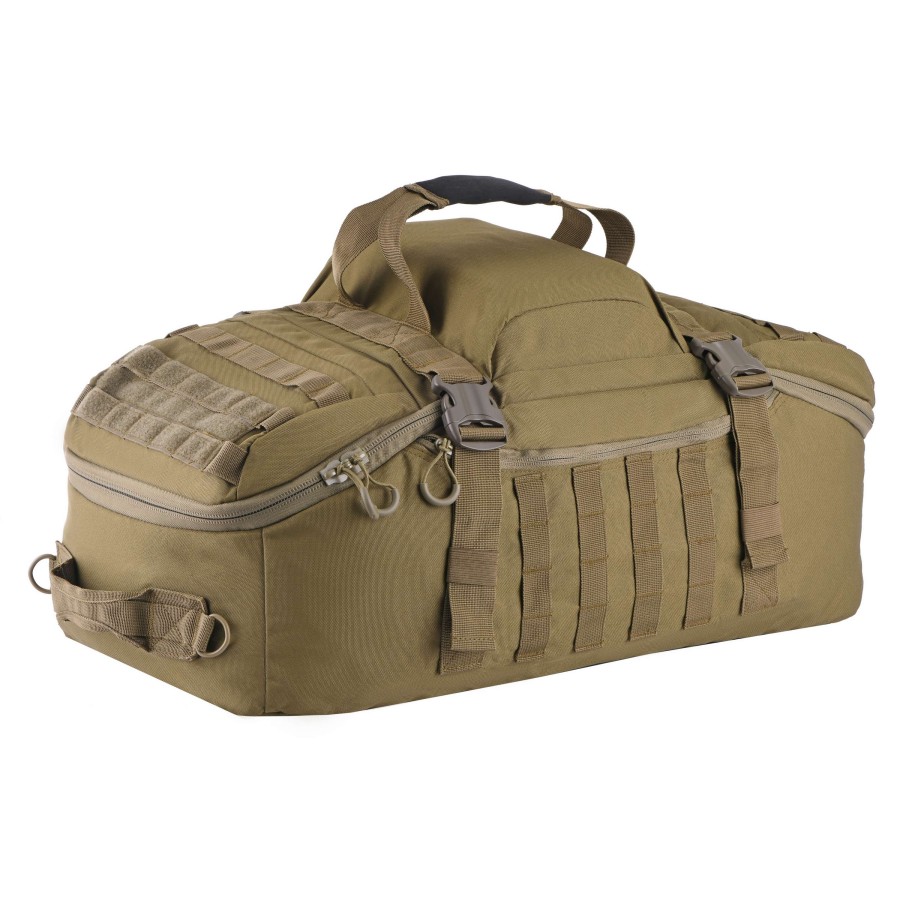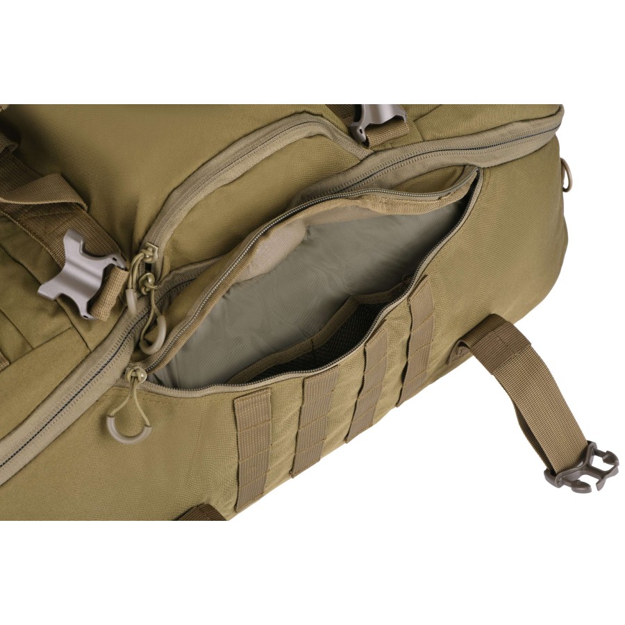 Виріб у кольорі OD Green виготовлено зі стійких до зношування матеріалів (поліестер і нейлон), тож слугуватиме він надійно й впродовж тривалого часу. Сумка-баул доволі містка, її корисний об’єм становить 50 л – вміститься найнеобхідніше спорядження, одяг, речі тощо. До того ж, крім основного відділення, є ще й бічні додаткові кишені для зберігання різноманітних дрібничок. Чи не найголовнішою особливістю моделі є можливість перенесення трьома різними способами, зокрема: конструкцією передбачено посилені руків’я для носіння в руках, знімний плечовий ремінь із пом’якшувальною сітчастою накладкою, а також у прихованій кишені зберігаються знімні плечові ремінці для використання виробу як рюкзак.