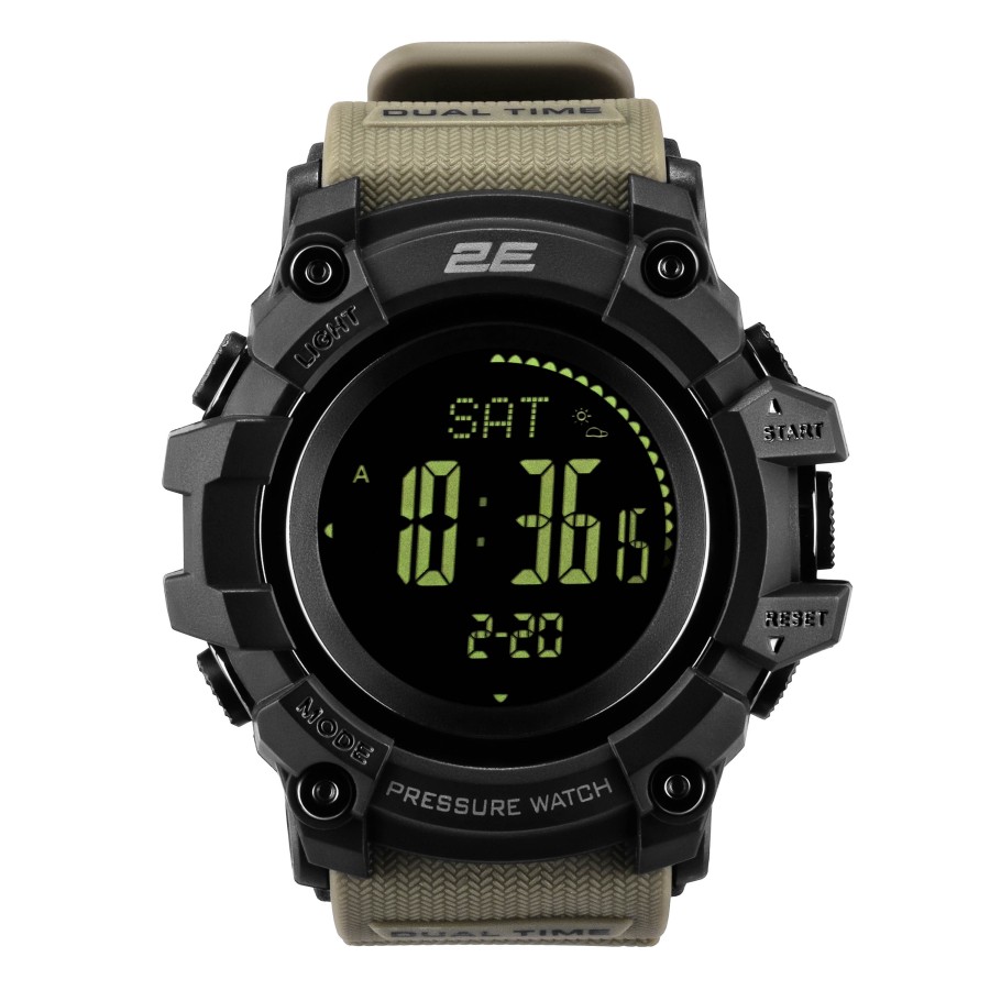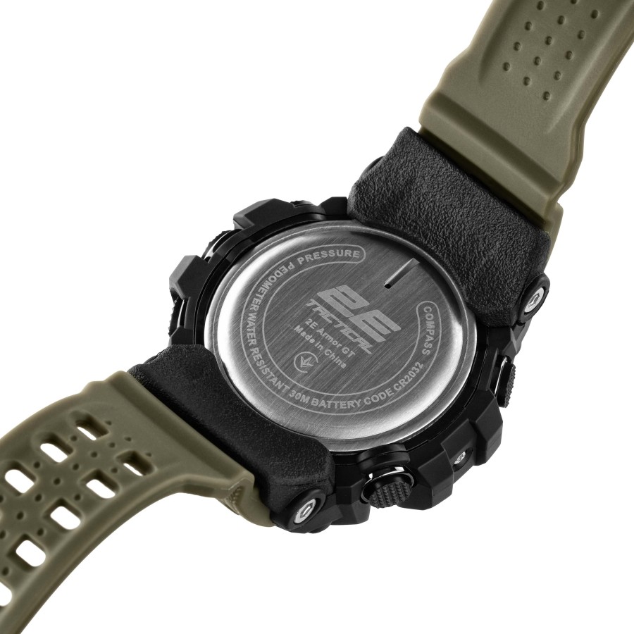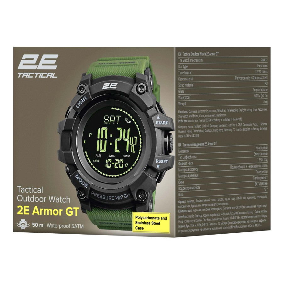 Перевагою годинника 2E Armor GT є низка корисних функцій таких, як компас, барометр, прогноз погоди, крокомір, секундомір, світовий час, будильник та освітлення. Завдяки цьому його можна використовувати за різних умов і ситуацій: від щоденного носіння до екстремальних подорожей.