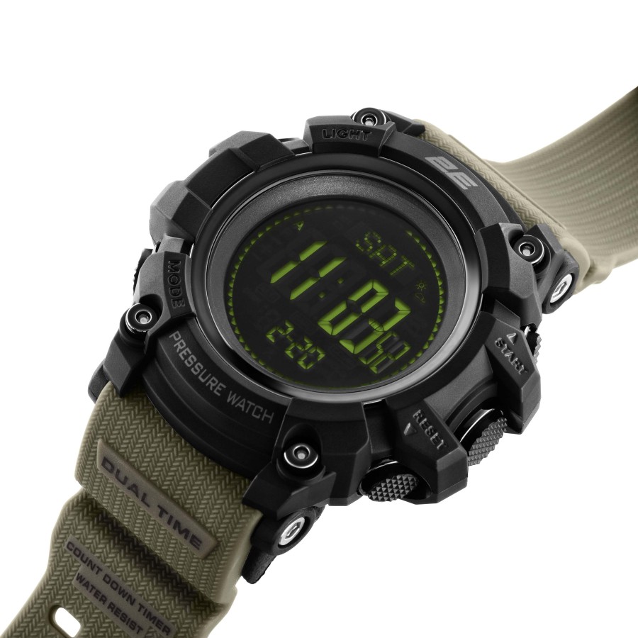 Годинник оснащено кварцовим механізмом, який гарантує високу точність і стабільність ходу. Забезпечено можливість вибрати формат часу (12/24 години) на електронному циферблаті та зручність перегляду його у будь-який момент. З-поміж головних особливостей – витривалий корпус зеленого кольору з полікарбонату та нержавіючої сталі, який забезпечує високу стійкість до різноманітних механічних пошкоджень. Зручний ремінець із поліуретану надійно фіксує годинник на зап’ясті. Годинник працює від батареї типу CR2032, яку вже встановлено. За всієї своєї брутальності годинник важить лише 76 г, тож не обтяжуватиме руку і не перешкоджатиме вільному пересуванню.