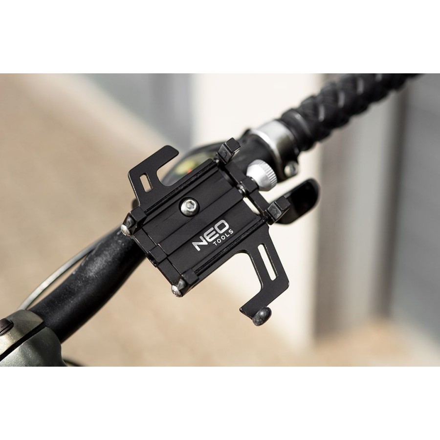 Монтується за допомогою хомута на трубку з максимальним діаметром 35 мм. До комплекту входять силіконові гумки та фіксуючий ключ. Тримач дозволяє розміщувати телефон вертикально або горизонтально. Він дозволяє переглядати навігацію під час їзди і сумісний з більшістю скутерів, велосипедів, мотоциклів і дитячих колясок. Бренд NEO рекомендується для користувачів транспортних засобів.
