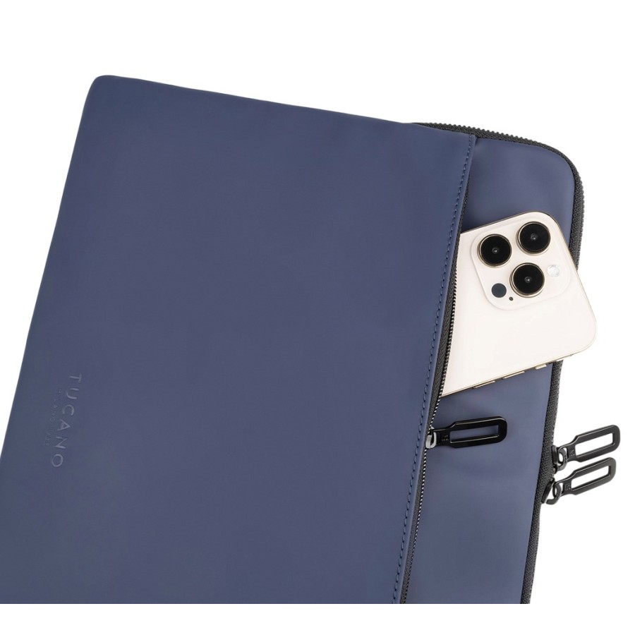 Водонепроникний чохол із прогумованого матеріалу Tucano Gommo для MacBook Pro 16" або для ноутбуків 16". Він має одне м’яке відділення з вбудованими неопреновими кутовими клапанами, які призначені для захисту кутів ноутбука, а також зручну зовнішню кишеню для аксесуарів на блискавці.