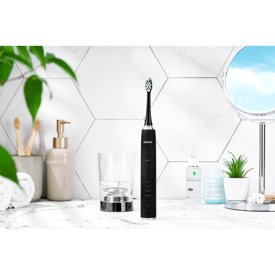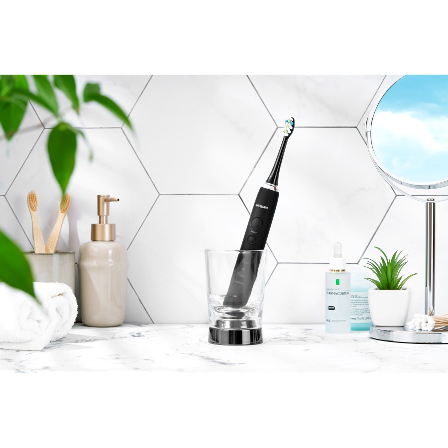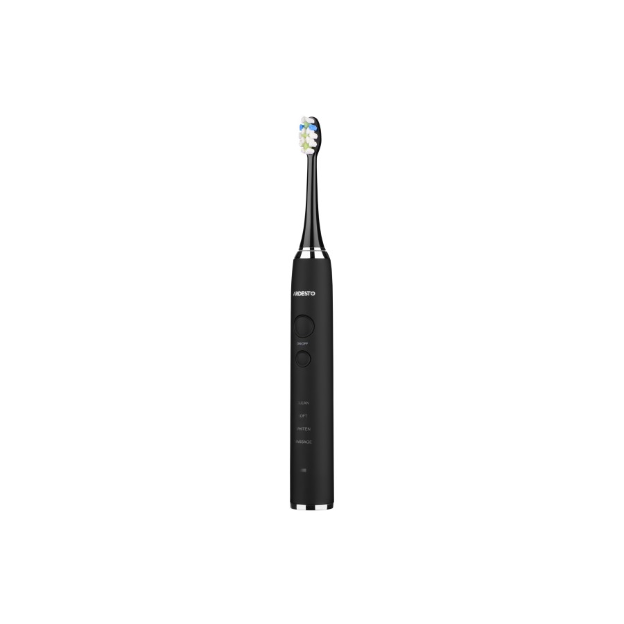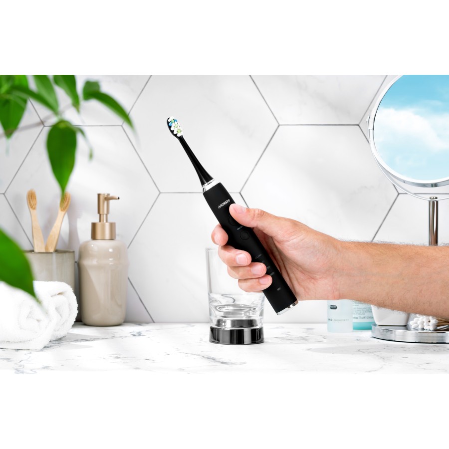 Електрична зубна щітка із середньою жорсткістю щетини забезпечує ефективне та безпечне чищення зубів із дбайливим ставленням до ясен і ротової порожнини. Ергономічна форма ручки робить процедуру зручною та приємною. Сучасна звукова технологія чищення із частотою пульсації – 40 000 рухів на хвилину. Є чотири режими для різних потреб зі світлодіодною індикацією вибраного режиму на корпусі: стандартне чищення, для чутливих зубів, відбілювання, масаж ясен. У комплекті є чотири додаткові класичні насадки і дорожній футляр із відділенням для двох насадок.