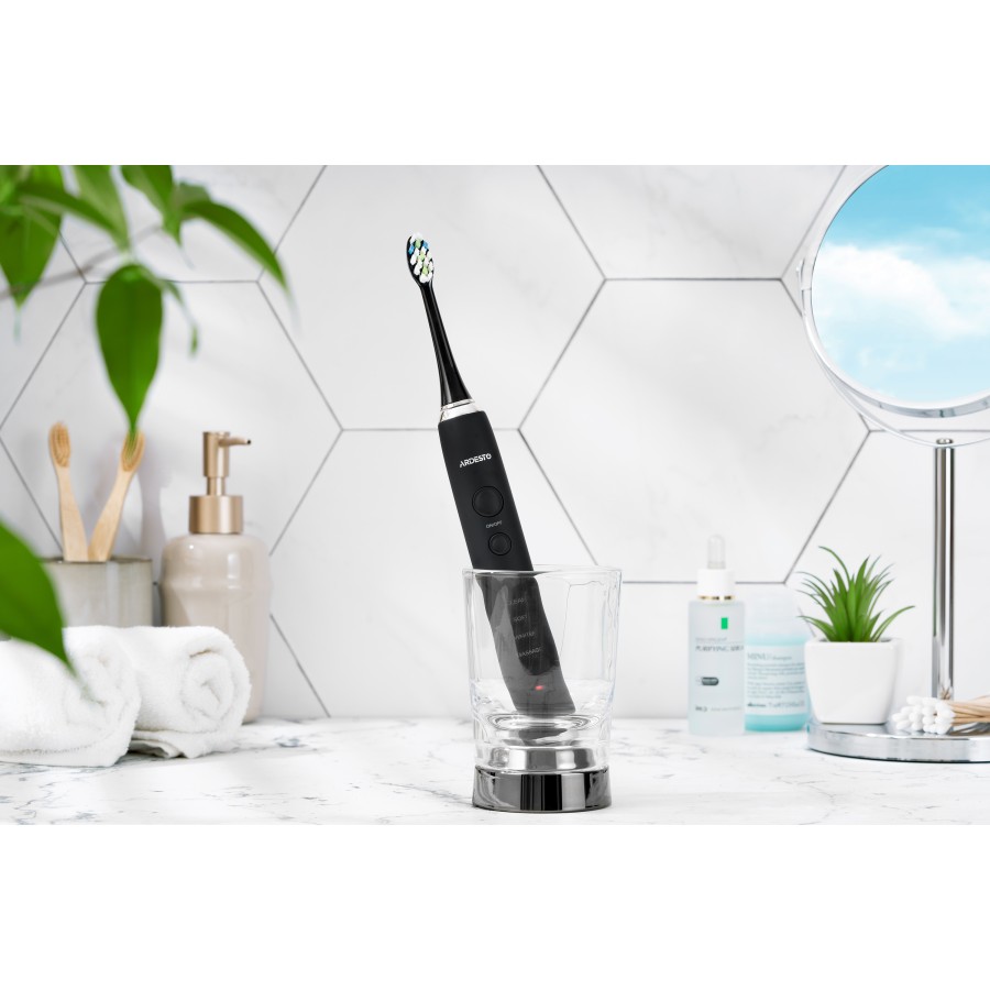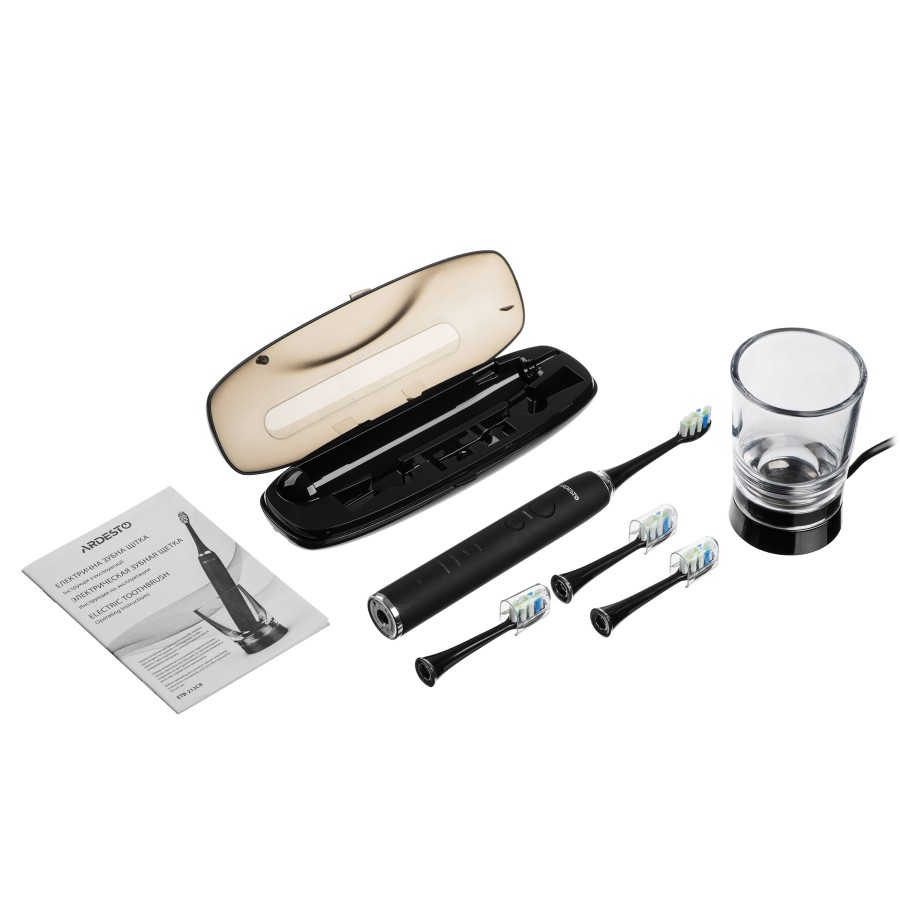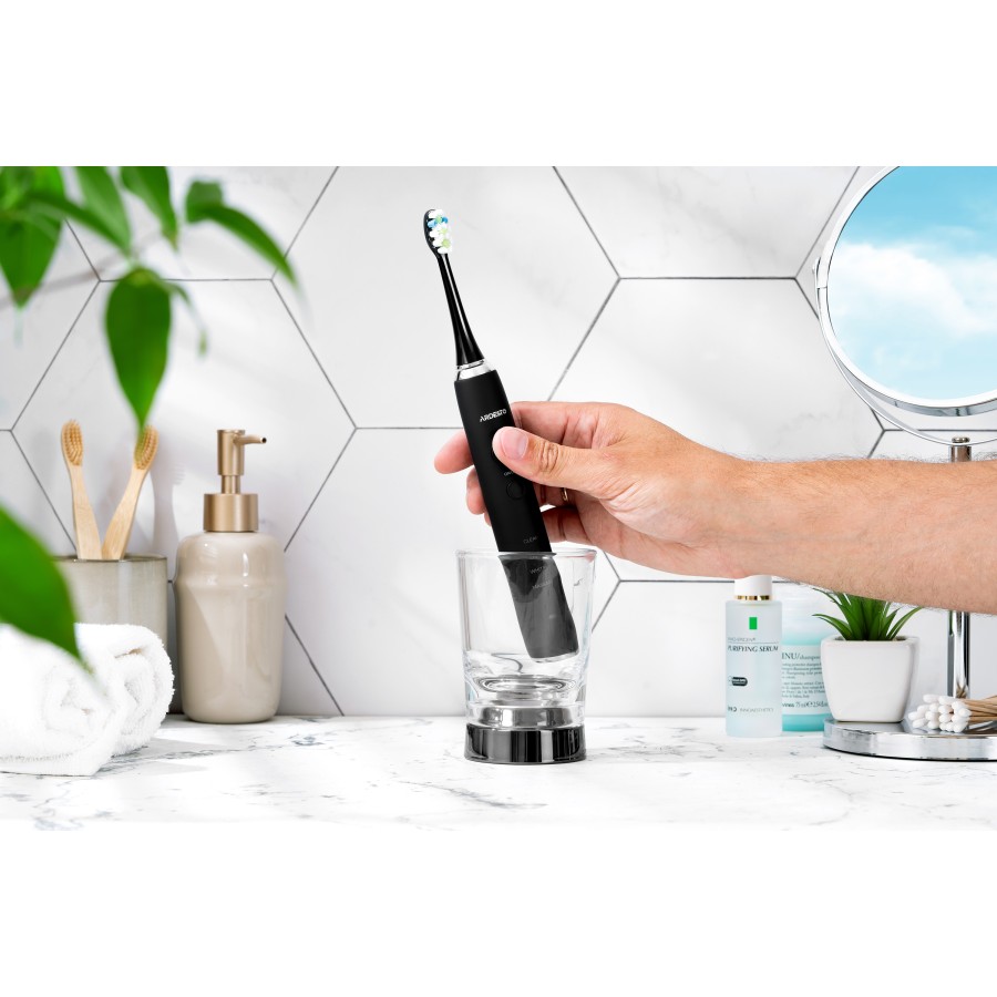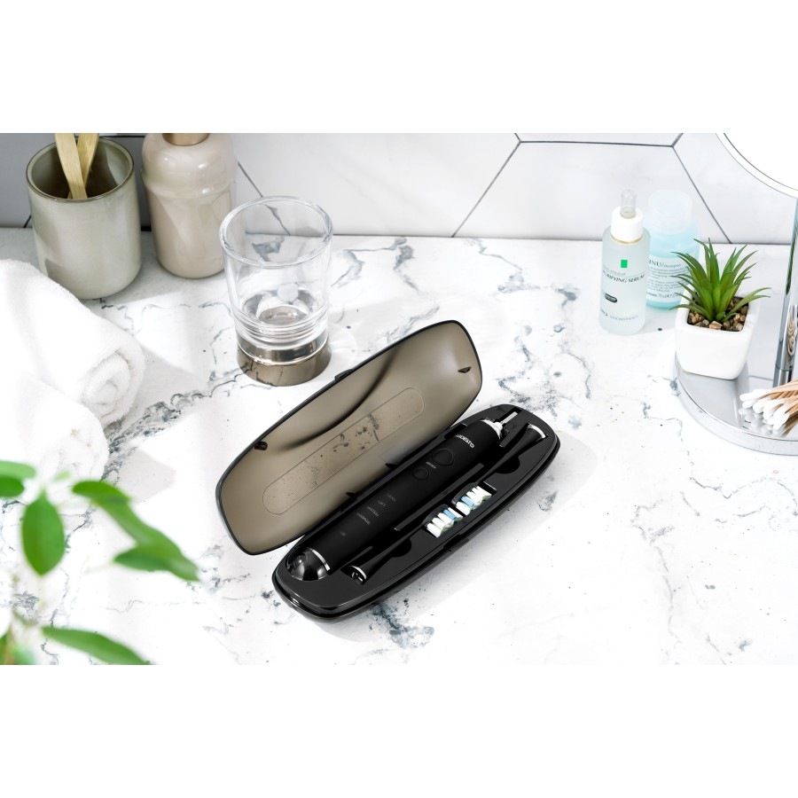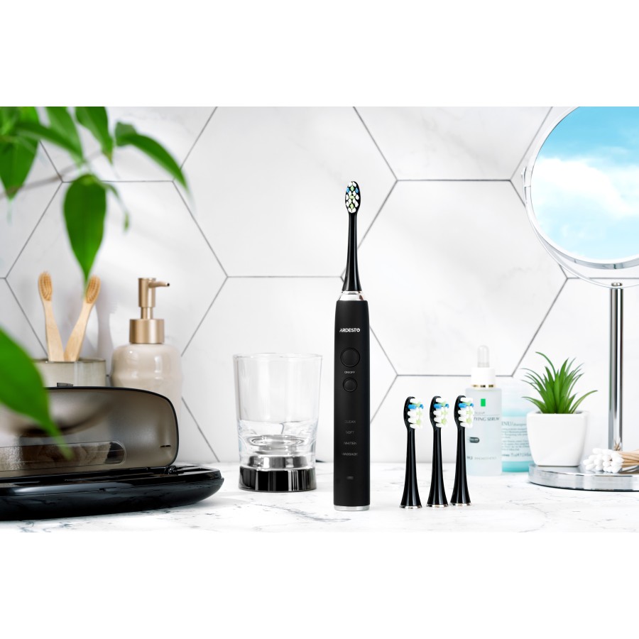 Електрична зубна щітка із середньою жорсткістю щетини забезпечує ефективне та безпечне чищення зубів із дбайливим ставленням до ясен і ротової порожнини. Ергономічна форма ручки робить процедуру зручною та приємною. Сучасна звукова технологія чищення із частотою пульсації – 40 000 рухів на хвилину. Є чотири режими для різних потреб зі світлодіодною індикацією вибраного режиму на корпусі: стандартне чищення, для чутливих зубів, відбілювання, масаж ясен. У комплекті є чотири додаткові класичні насадки і дорожній футляр із відділенням для двох насадок.