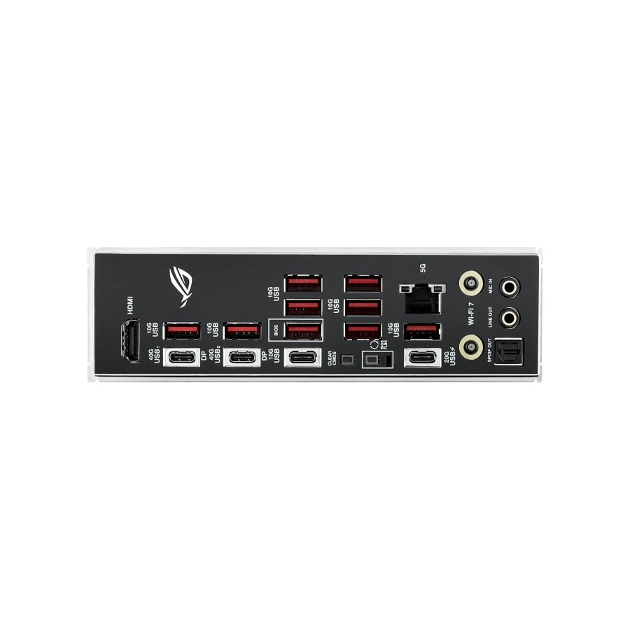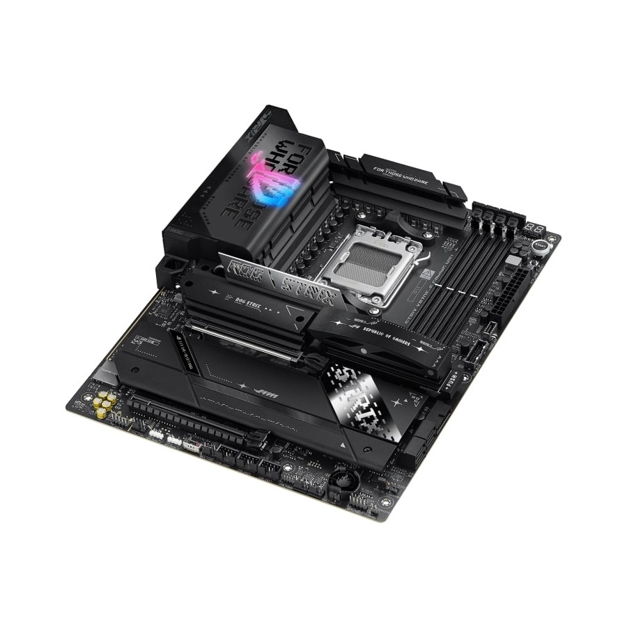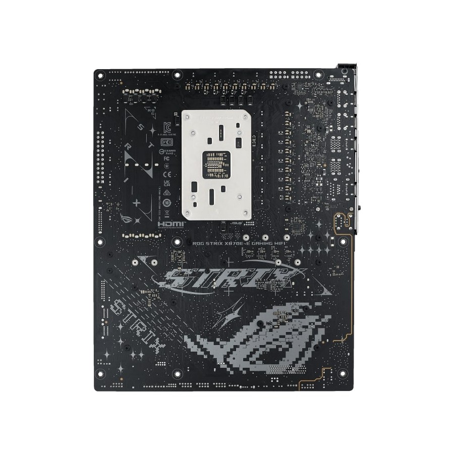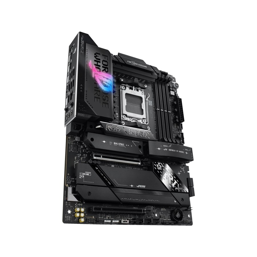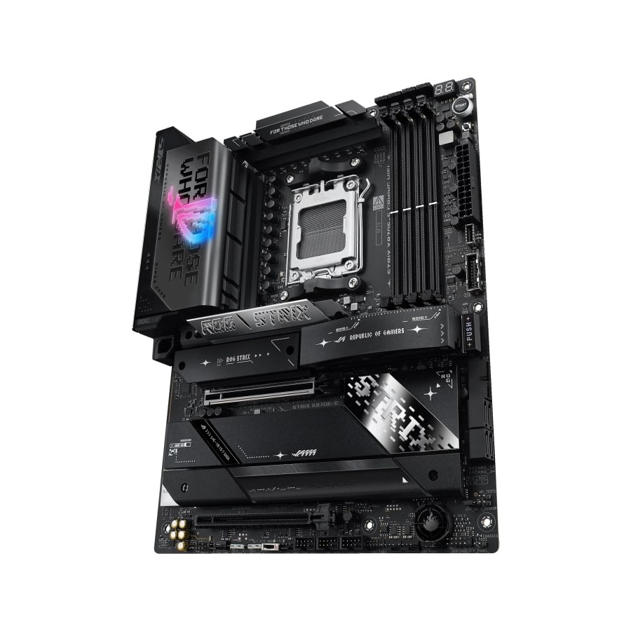 Діагональні планки, шліфований алюміній і яскравий RGB стали візитними картками естетики ROG, і Strix X870E-E з гордістю носить усі ці риси. Але в цьому поколінні напівпрозорі дифузори вкривають кожух вводу/виводу та матрицю Q-Release, м'яко контрастуючи з розташованими поруч металевими радіаторами.