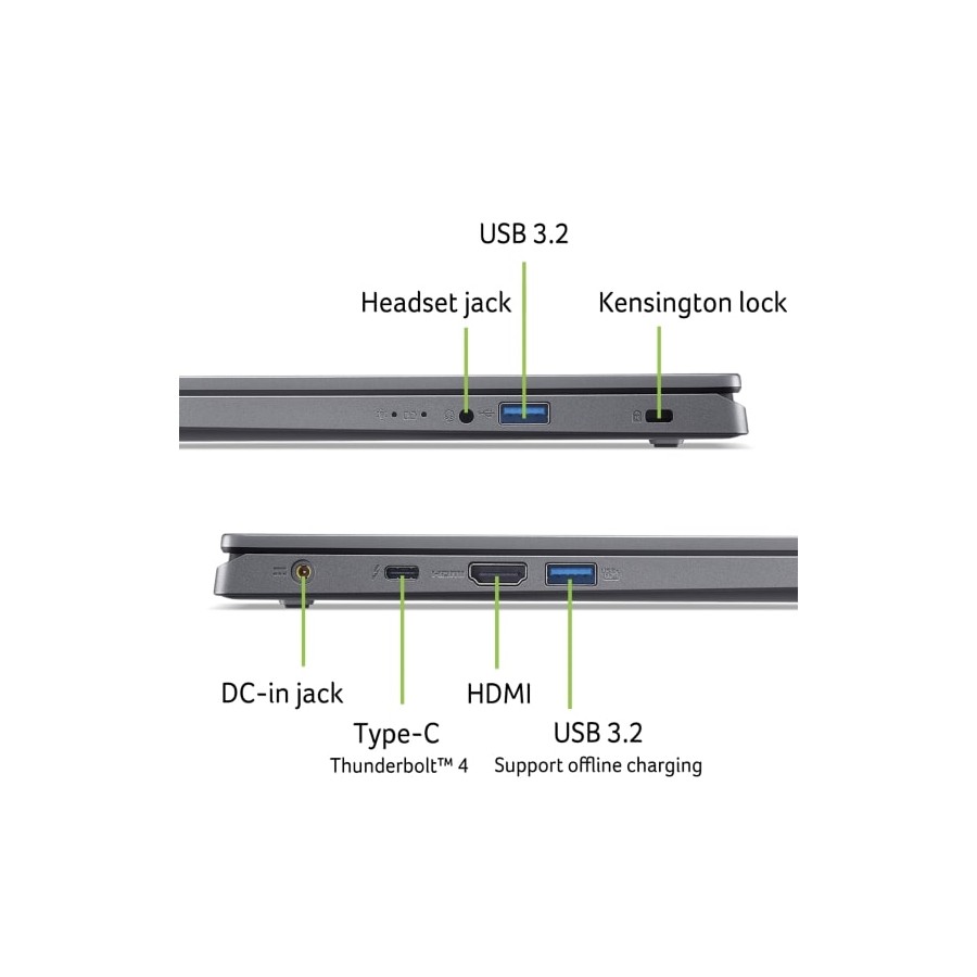 Ноутбук обладнаний усім необхідним для комфортної роботи: портами USB (включно з USB 3.2), HDMI для підключення зовнішнього дисплея, комбінованим аудіороз’ємом і підтримкою дводіапазонного Wi-Fi. Це дозволяє швидко підключати периферійні пристрої, зовнішні накопичувачі, а також легко виходити в Інтернет.