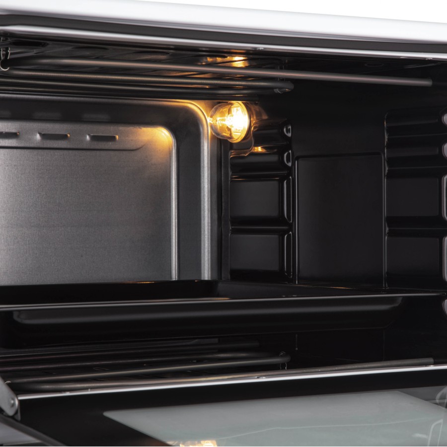 Піч має внутрішнє освітлення, що надає змогу спостерігати за стравами, не порушуючи температурний режим, а дверцята з міцного загартованого скла та поліпшена теплоізоляція гарантують безпеку. Хромовані нагрівальні елементи та емальована внутрішня камера – запорука тривалої експлуатації пристрою. У комплекті – прямокутне та кругле дека, решітка для гриля. Стійкість печі забезпечують нековзні ніжки.