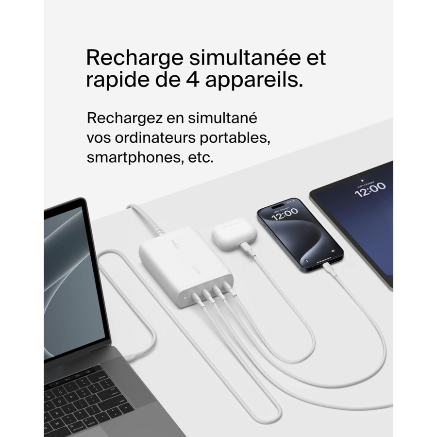 Belkin WCH015VFWH — це універсальний і потужний зарядний пристрій нового покоління, створений для швидкого заряджання одразу кількох пристроїв. Завдяки потужності 200 Вт і чотирьом портам USB-C, він забезпечує високу швидкість заряджання навіть для вимогливих гаджетів, таких як ноутбуки, планшети або смартфони.