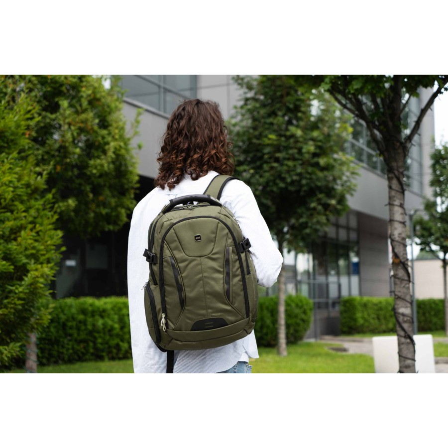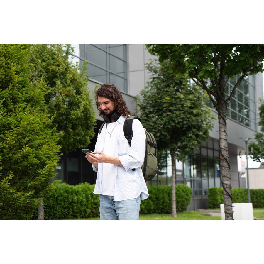 Одна з головних особливостей моделі – продумана конструкція. Відділення для ноутбука розгортається на 180º, зокрема це зручно під час проходження митного контролю в аеропортах. Стінки кишені для лептопа мають м’який наповнювач для кращого захисту вмісту, а також фіксувальний пасок на липучці. У тому ж відділенні передбачено відокремлену захищену кишеню для планшетів до 13″, кишеню для повербанка та кабель для заряджання, який виведено в ліву плечову лямку.