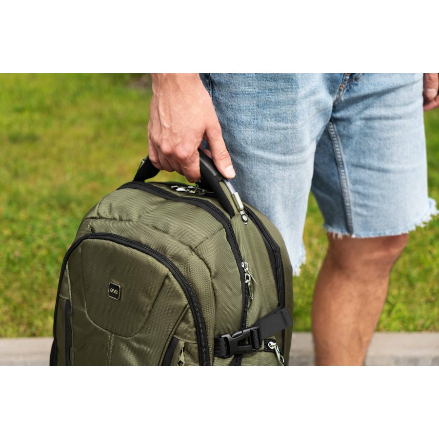 Рюкзак 2Е Ultimate SmartPack придатний для тривалого носіння й навряд чи спричинить дискомфорт, а все завдяки м’яким плечовим ременям, які можна регулювати по довжині. Крім того, тильна панель виконана із сітчастого («дихаючого») матеріалу, також на ній вшитий пасок для фіксації рюкзака на телескопічній ручці валізи. Надійність під час перенесення забезпечує міцне руків’я, що складається з трьох шарів: поліестер із наповнювачем, металевий ізольований трос, який кріпиться двома заклепками, а вкриває все прогумована тканина.