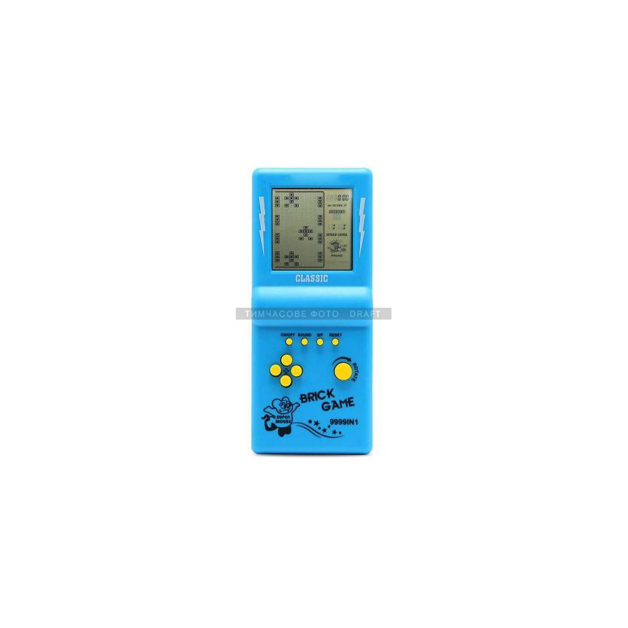 Синій пластиковий корпус із блискавками, жовті кнопки й легендарний напис BRICK GAME 9 999 in 1 – ось він, справжній символ 90-х. На передній панелі все впізнаване: велика жовта кнопка-обертач, класичний хрестовий джойстик, кнопки керування звуком і швидкістю.
