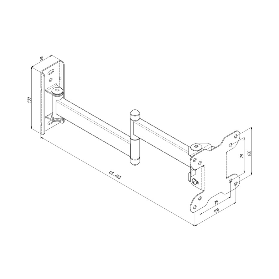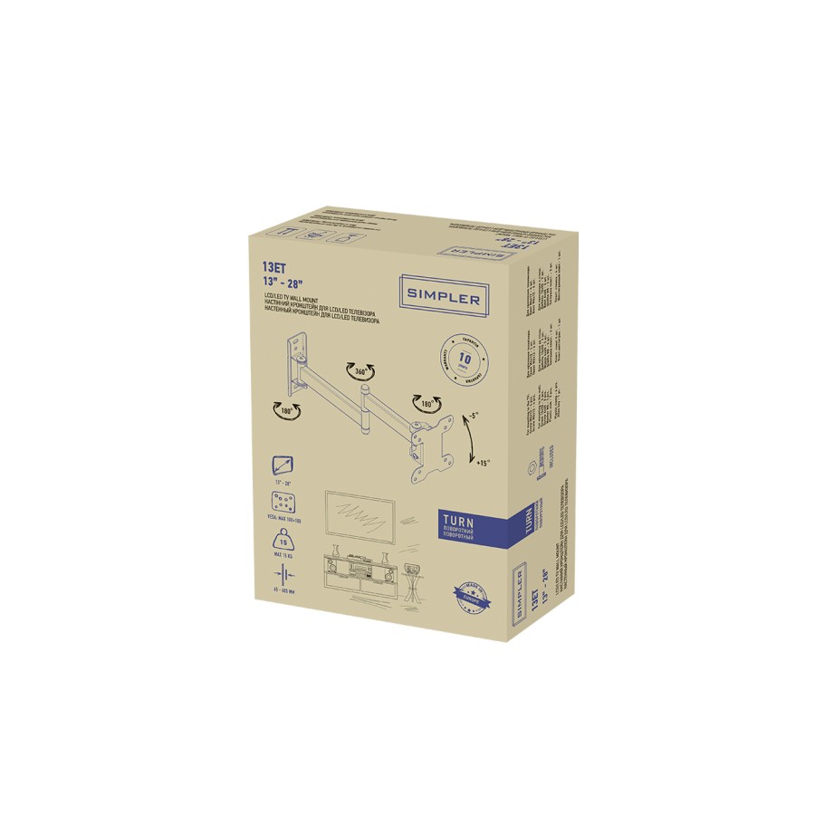 Настінний похило-поворотний кронштейн Simpler 13ET. Що потрібно знати, щоб правильно підібрати кронштейн до телевізора? Діагональ екрану, вага телевізора та стандарт кріплення VESA - відстань між кріпильними отворами на задній панелі телевізора. Всю цю інформацію ви легко знайдете в характеристиках вашого телевізора, на упаковці або в інструкції. Кронштейн підходить для плазмових, LCD, LED телевізорів і моніторів з діагоналлю 13-28 дюйма і вагою до 15 кг. Підтримуваний стандарт VESA: від 75×75 мм до 100×100 мм.